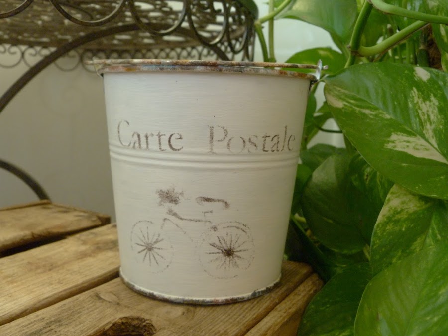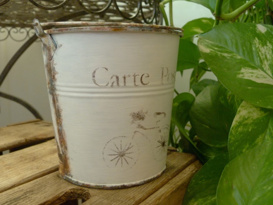 El primer cubo. En este caso, decoupage únicamente en una de las caras. Después, simulé óxido con pintura en bordes, asa y juntas. También podéis ver esta técnica aquí. En la parte trasera, estarcidos apenas marcados.