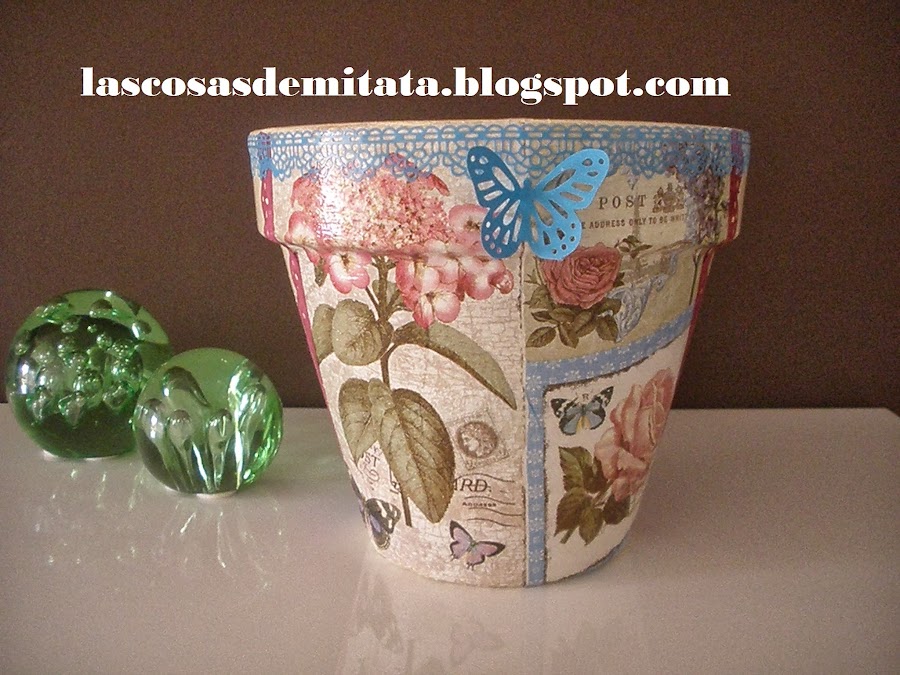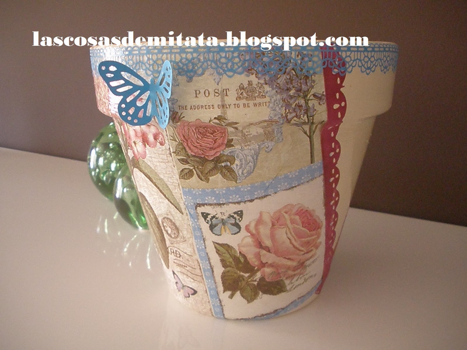 Hoy os enseño este macetero decorado que va destinado a la persona que mas mano tiene con las plantas y que además hoy es su cumpleaños, mi madre!!!! Cumple nada más y nada menos que 64 añazos y guapisima que está. Seguro que le gusta porque las plantas son su pasión, así que voy ahora mismo al vivero a buscarle una :-P Feliz mañana de Miércoles, muack!