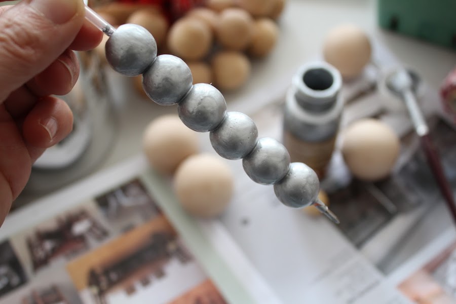 No tenía nada planificado, así que fueron saliendo según la marcha, un truquillo, para pintar las bolas pequeñas de madera y que aquello no acabase con pintura plateada por toda la mesa usé una mina de bolígrafo como veis en la foto y para secarlas y que no se pegasen unas a otras, un vaso de vela de base.