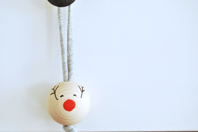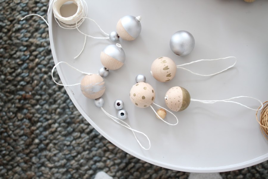 Quería dejar mucha madera a la vista, así que combiné bolas pintadas por la mitad (con cinta adhesiva), lunares, corazones... ahí ya cada cual es libre de improvisar y ese en realidad es el momento más divertido de todo.