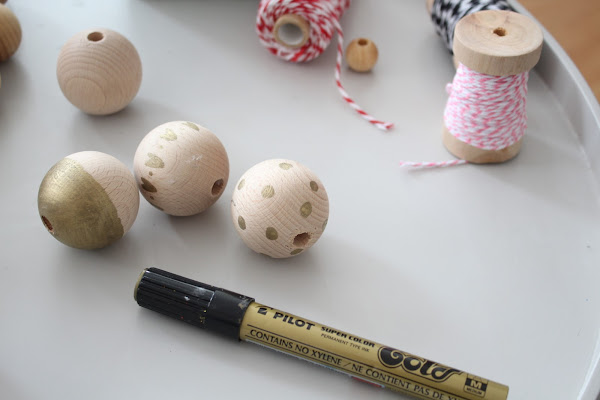 Aproveché: las bolas de madera que tenía de otros proyectos de Handbox, una pintura metálica que me habían enviado en un lote La Pajarita que no había tenido ocasión de utilizar y que es increíble, un gran descubrimiento, ahora todo lo quiero pintar así :-), un rotulador dorado (otro gran descubrimiento) y cinta de empaquetar de Ikea.