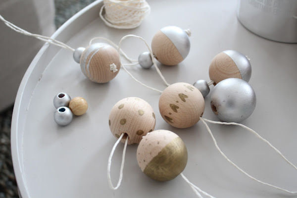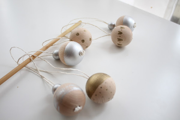 Así que rescaté la idea de las bolas de madera pintadas que hice hace dos años y que me parecen ideales y como se trataba de no complicarme la vida y usar materiales que ya tenía en casa (afortunadamente este salón es como un almacén de mi época más productiva), esta vez probé con dorados y plateados. Os cuento: