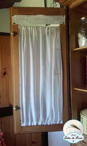 Tenía por casa una cinta de croché que hizo mi hermana o mi madre (no recuerdo) para un camisón cuando éramos pequeñas. El camisón se quedó en proyecto, así que la cinta estaba intacta. La coloqué en el interior con unas chinchetas y a partir de esa altura preparé el visillo.