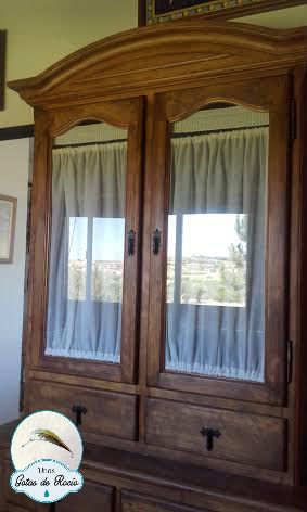 El mueble en cuestión es este. Al natural, mucho más bonito que en fotografía. Como veis, la parte de arriba de la vitrina es curva, con lo cual las barritas extensibles que se sujetan en el marco no cubren toda la superficie. Y como no me apetecía descambiarlas por unas de las que se sujetan con una puntillita y por tanto sí servirían, tuve que emplear la imaginación.