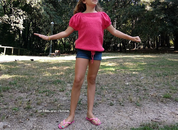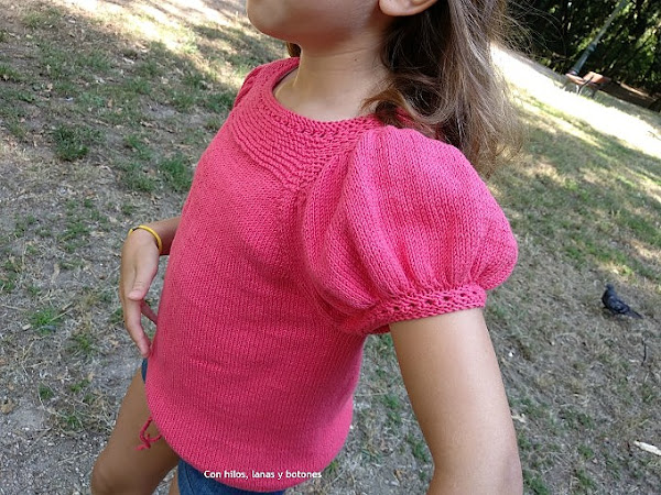 Hice un pequeño cambio tanto en las mangas como en el bajo de la camiseta. En ambos sitios lleva una línea de ojales para poder pasar una cinta. a mi niña no le hizo mucha gracia lo de las cintas con lazada en mangas y bajo cuando le enseñé el diseño antes de hacerlo, así que justo antes de la tira de ojales, aprovechando que ya se hacen menguados para fruncir, reduje más puntos de los indicados en el patrón para que ya me quedara la prenda más fruncida y quedara bien incluso sin el cordoncillo.