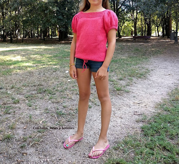 El patrón viene en varias tallas, desde 3/6 meses hasta 8/9 años. Yo tejí la talla mayor con DROPS Safran (color 13 - frambuesa) y aguja de 3mm. Necesité 5 ovillos. Al final le va un pelín grande, porque mi muestra de puntos no coincidía exactamente con la indicada en el patrón y me dio más talla. Pero no me importa demasiado, así la usa dos veranos seguidos.
