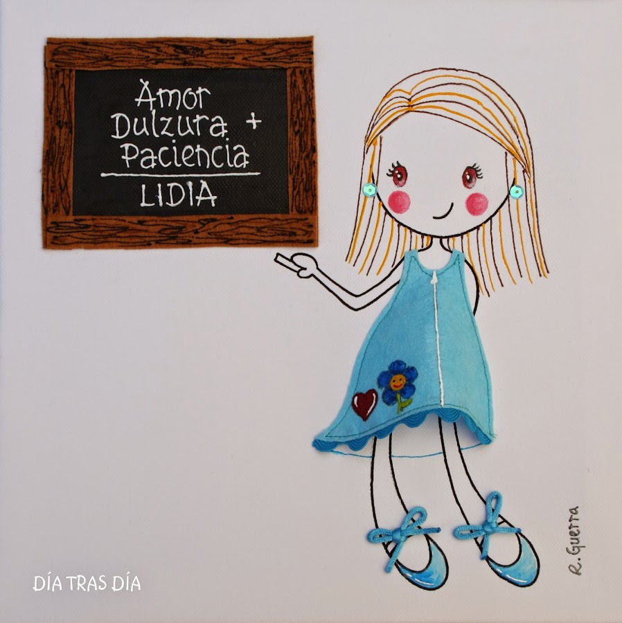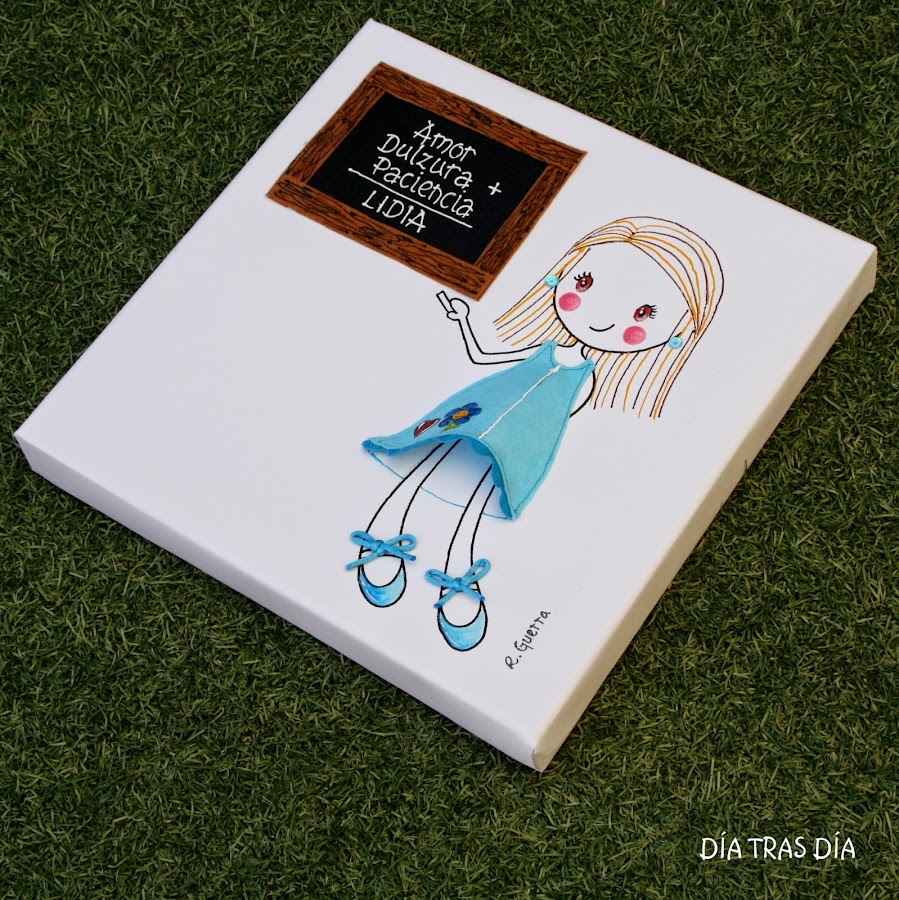 Montse me escribió para decirme que quería hacer un regalo a una de las seños de su hijo y que le habían encantado las camisetas Ro-ro maestra, pero que no le convencía la idea de hacerlo en camisetaporque no sabía qué talla usaba la seño. Estuvimos dándole vueltas y pensando opciones hasta que se nos ocurrió la posibilidad de hacerlo sobre un lienzo.