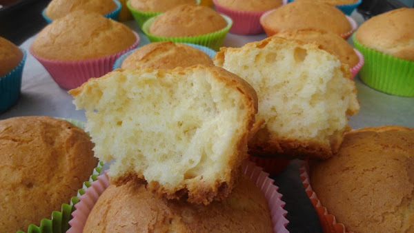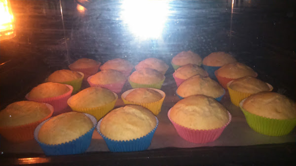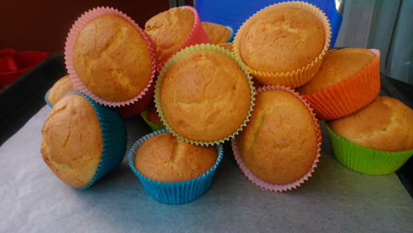 que bien le salieron las magdalenas...mi hija que está haciendo sus primeros experimentos en la cocina....y empezo con unas madaglenas...muy fáciles...os dejo la receta por si os animáis a hacerlas...