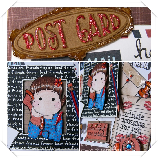 Algunos detalles de cerca, donde apreciar stickless (Postcard), el cable del teléfono, hecho con alambre, Crackle accents en telefono, maquina de escribir, sobres y pincho sujeta-papeles.