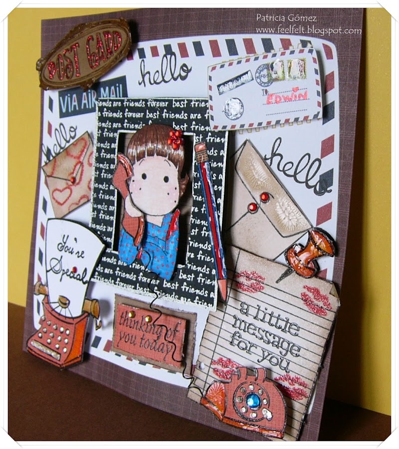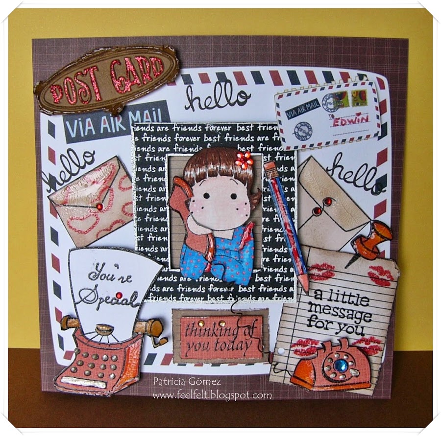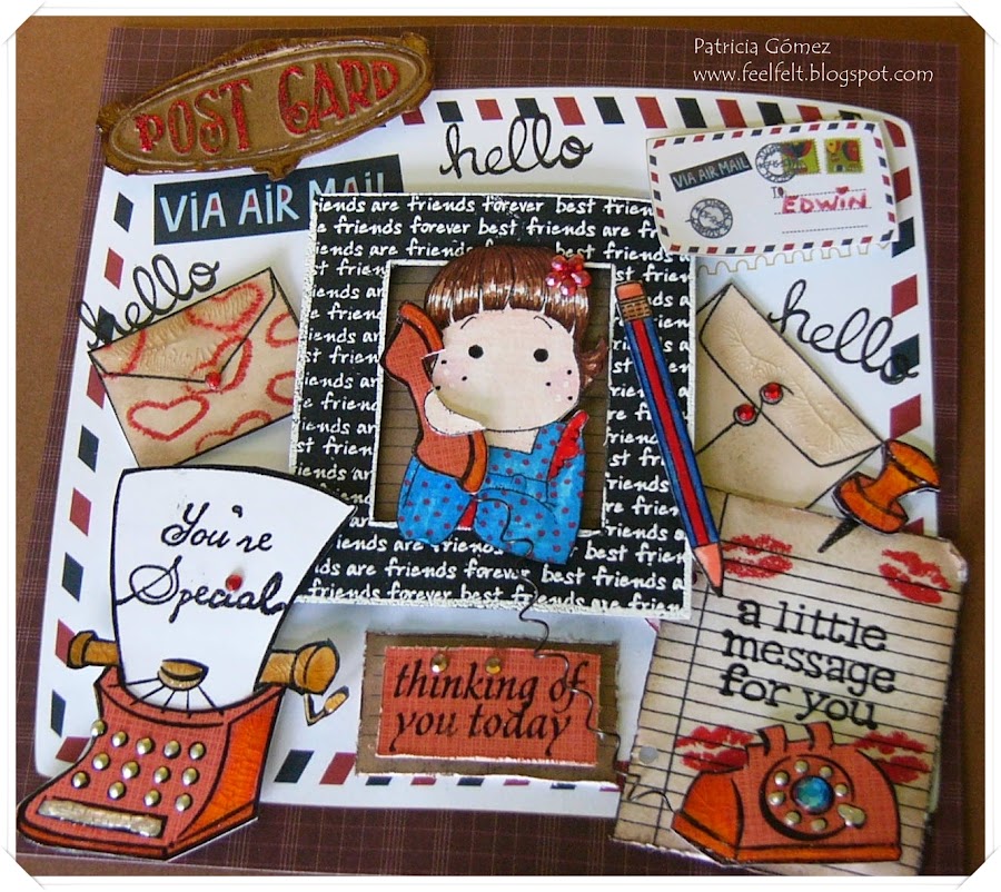 La magnolia ha sido coloreada con rotus, la maquina de escribir y telefono están hechos con paper piecing, y el letrero de Postcard es de una cartulina embosada con la big shot.
