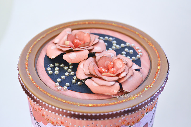 El troquel superior e inferior que bordea la lata está realizado con la troqueladora de Martha Stewart Doily Lace. En los agujeros de la misma puse stickles orange para resaltar.