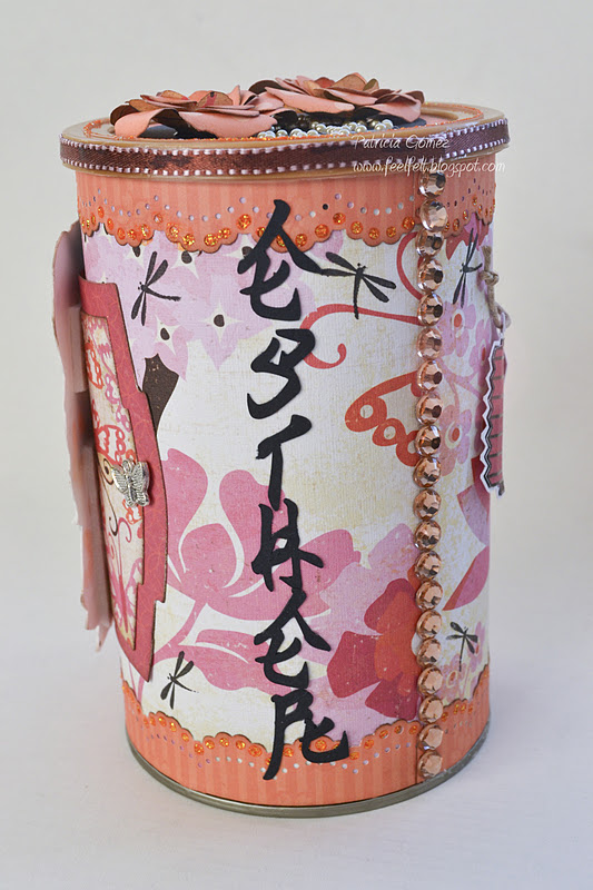 Las libélulas negras que vuelan por toda la lata, son sellos estampados directamente en el papel base, son de Hero Arts Good Fortune, igual que las lamparas chinescas, hechas con paperpiecing.