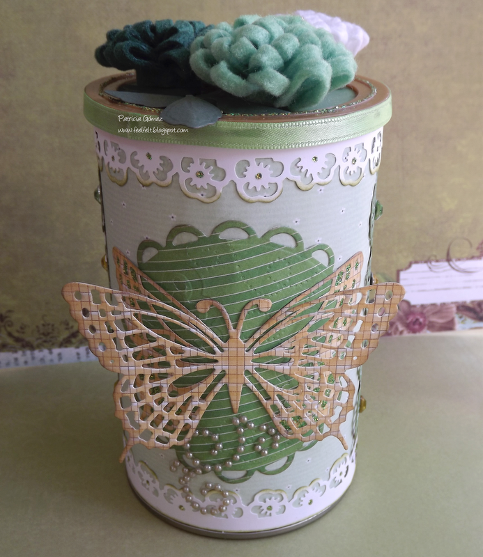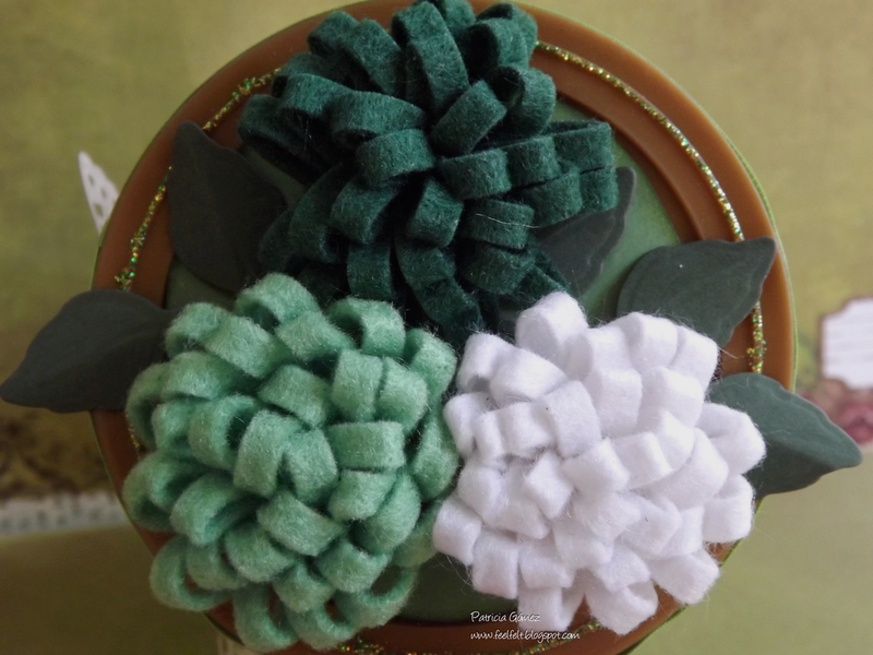 Las flores de la tapa, son troqueles de la big, hechos con Die-namics Loopy Bloom, cortados en fieltro. Las hojas son del set Spellbinders Foliage.