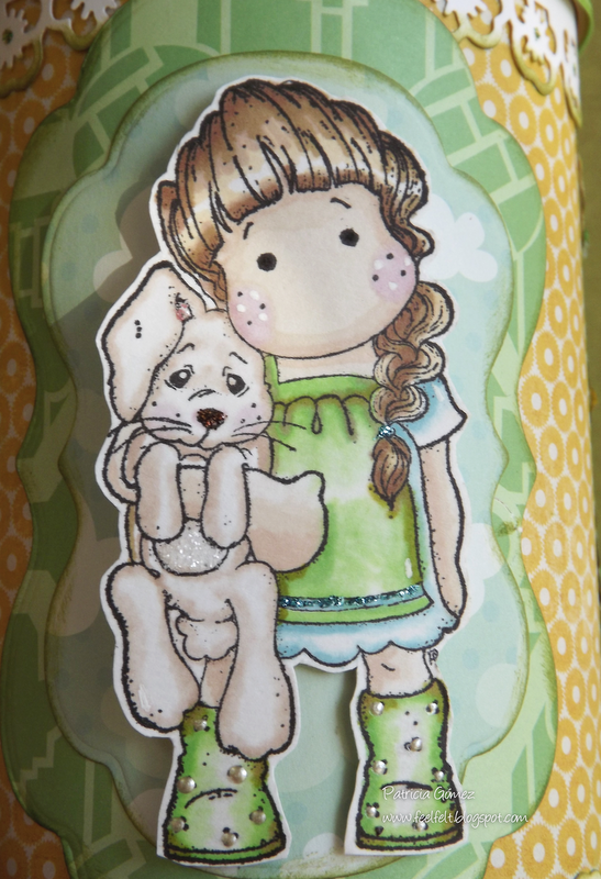 El sello central es Magnolia Tilda with Hanging Rabbit, coloreada con promarkers, y está sobre dos recortes de Spellbinders Nestabilities Labels 14 Fourteeen