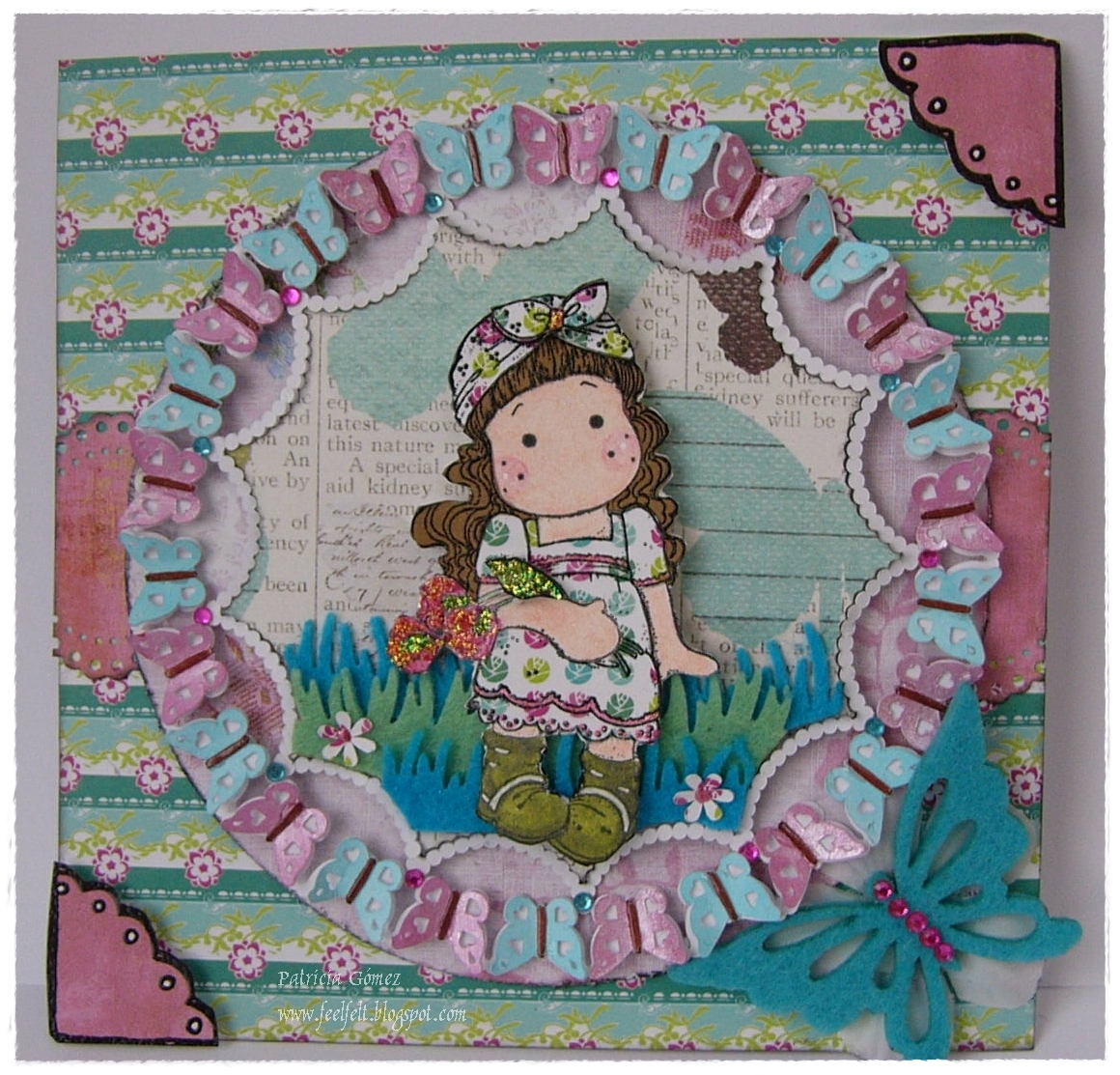La composición central, con mariposas, es un recorte de la craft (sí, por fin la desempolvé!) Cada mariposa está entintada en color rosa y turquesa respectivamente, y con toques de glossy en la parte marrón central.