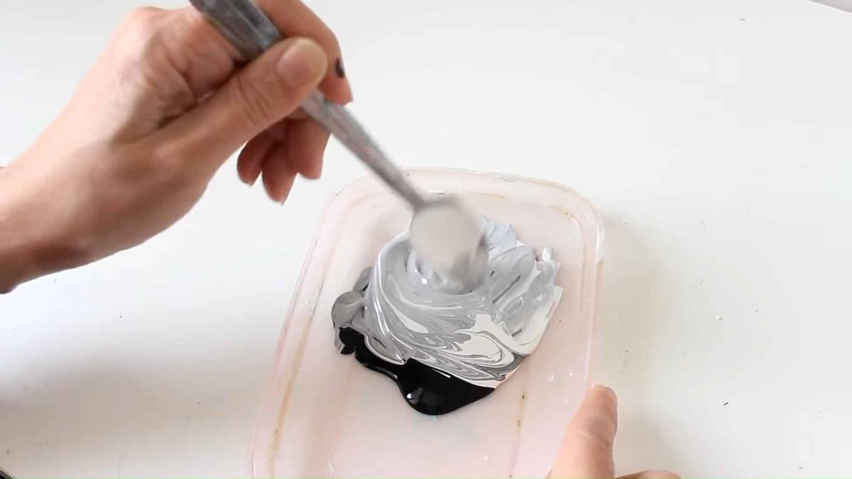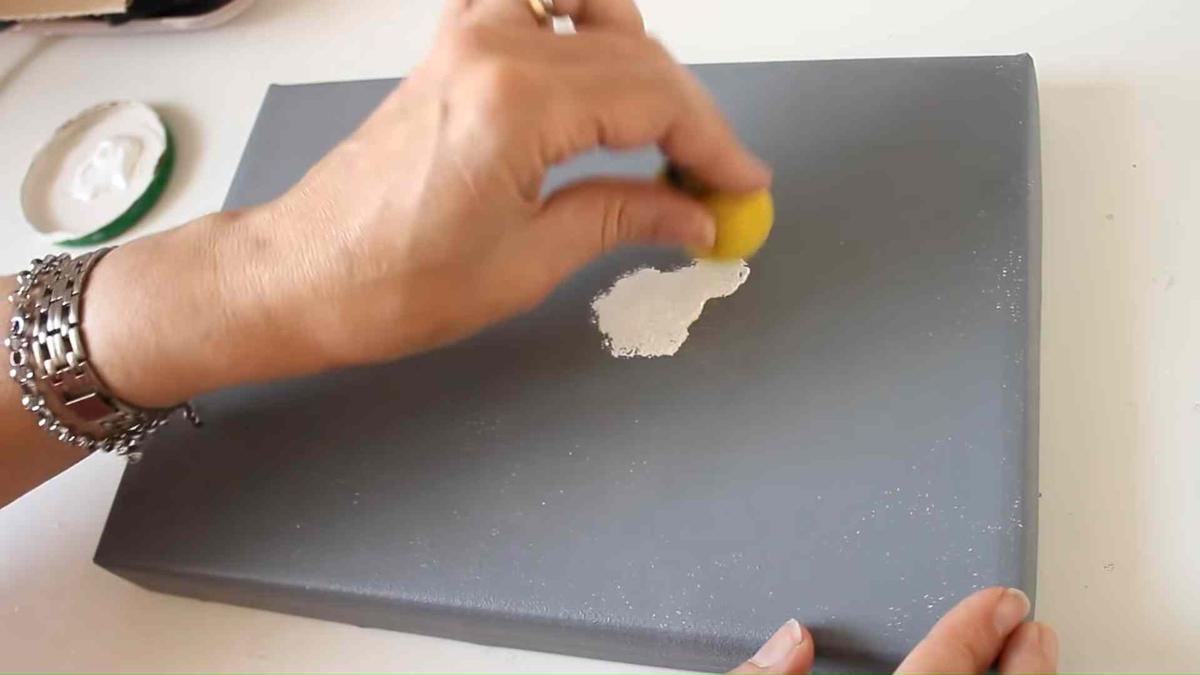 Esta es la caja de zapatos que voy a utilizar que es bastante firme y está en muy buenas condiciones en caso de que tuviese alguna rotura este es el momento de repararla antes de comenzar la decoración.lo primero que voy a hacer va a ser pintar la caja para eso voy a preparar un color gris con pintura acrílica negra y blanca para la aplicación voy a utilizar una esponja dando toquecitos muy suavemente para favorecer la adherencia de la pintura sobre la superficie de la caja le voy a aplicar una mano a dejar secar y después aplicar una segunda mano.