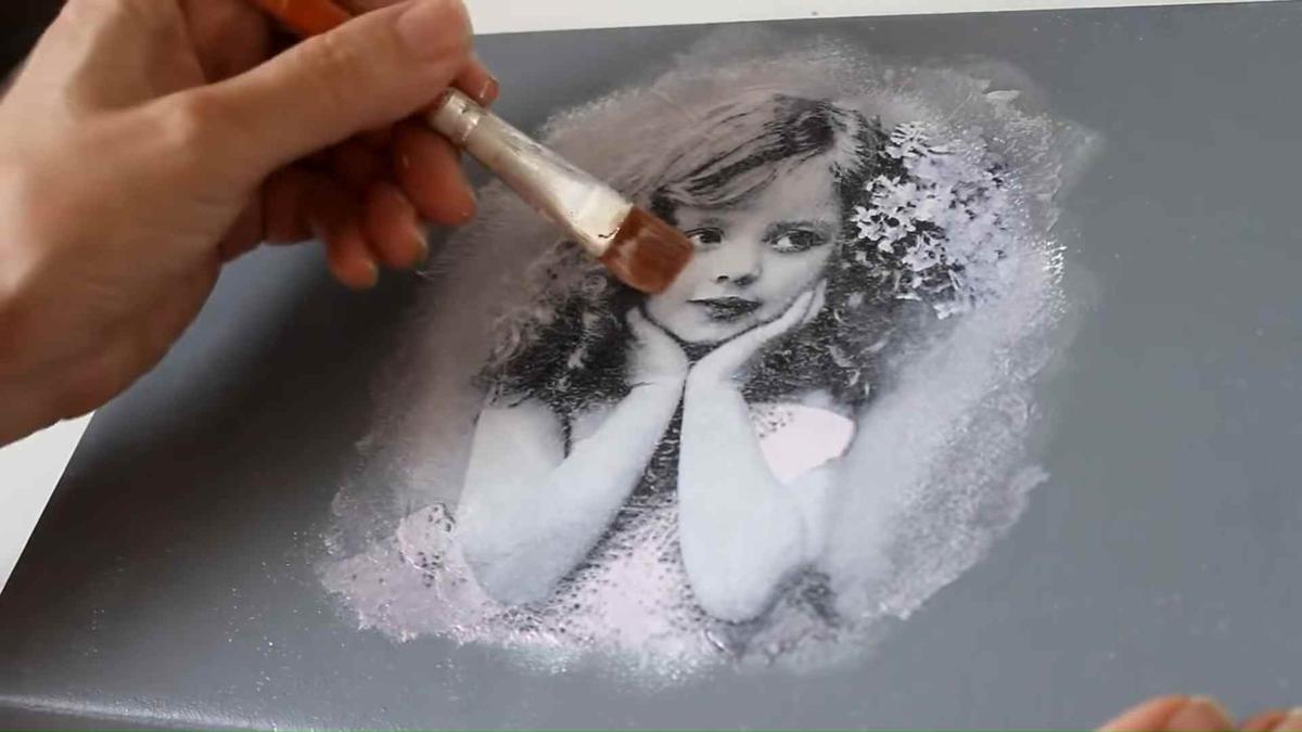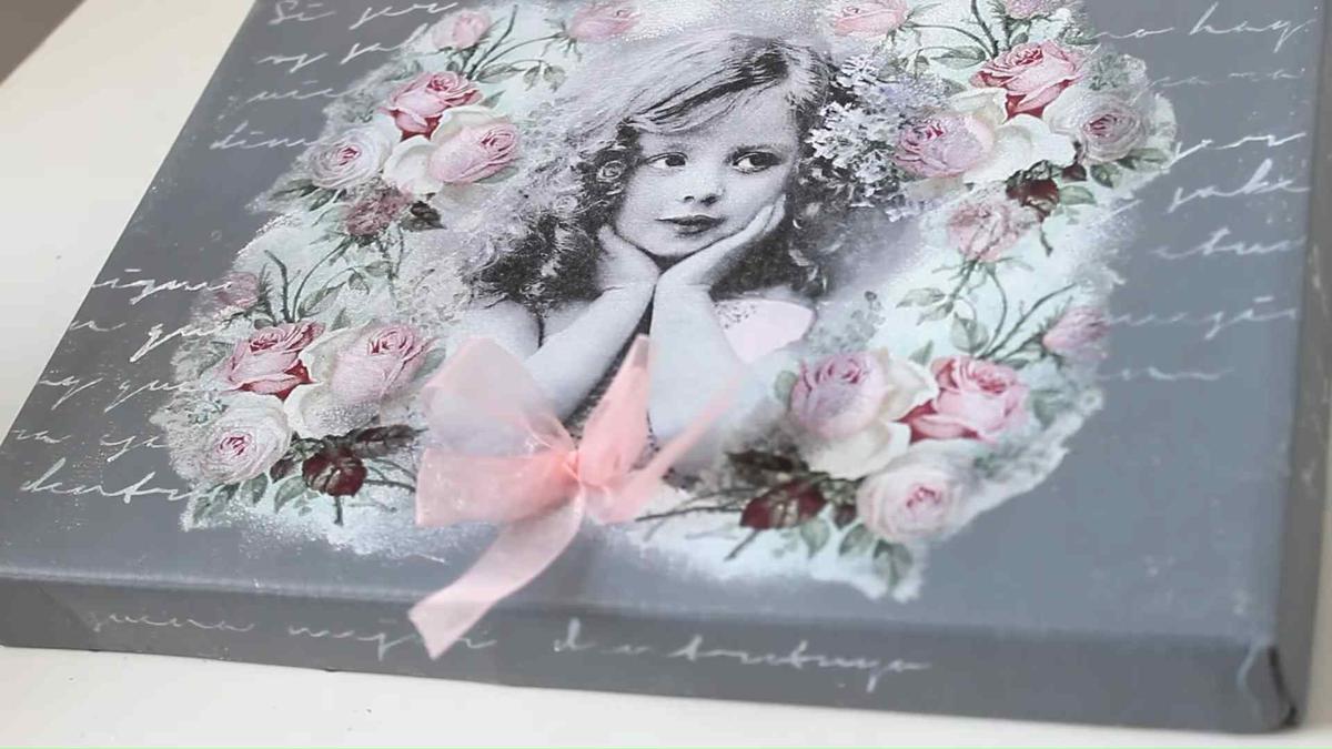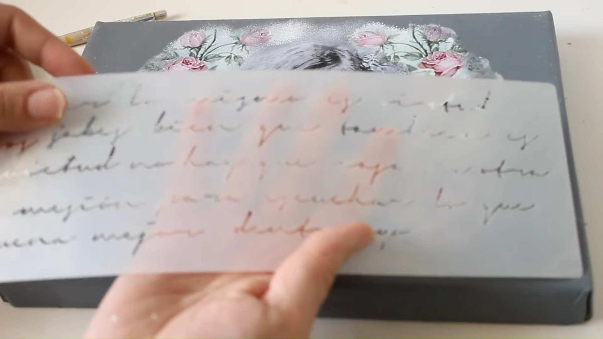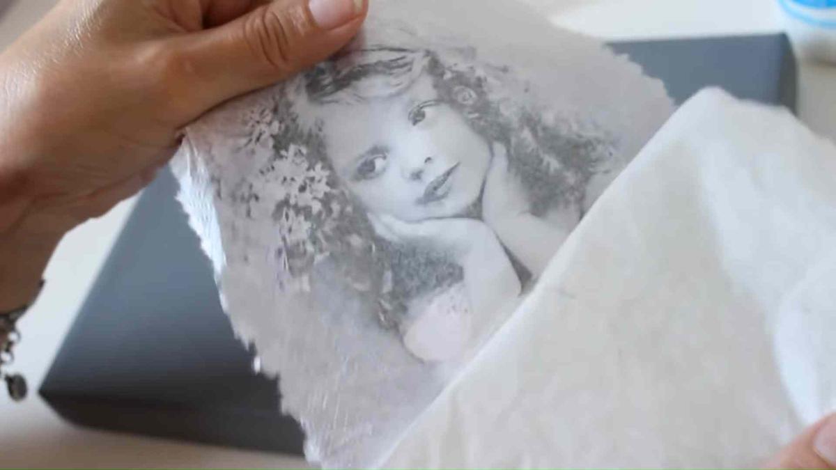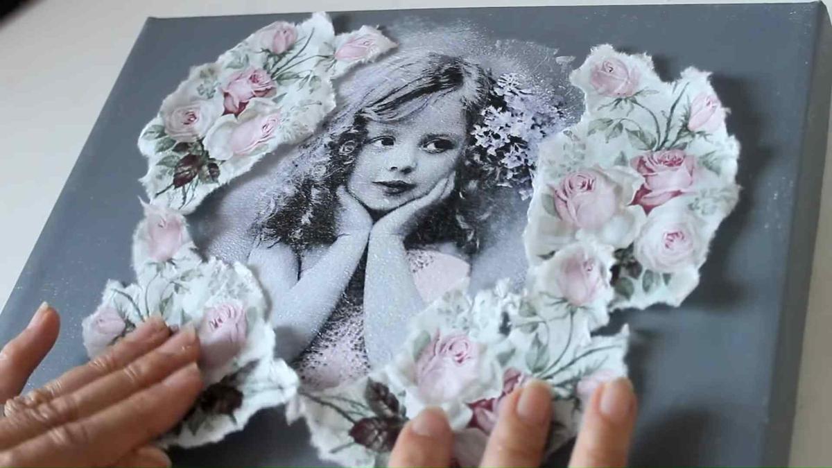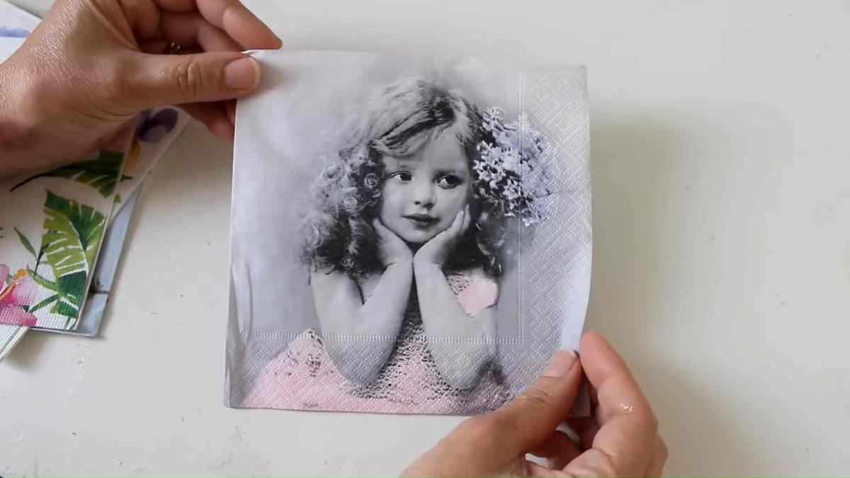 para hacer el decoupage voy a retirar las capas posteriores de la servilleta y cuando la pintura blanca esté bien seca le voy a pasar adhesivo vinílico escolar estirando lo bien en una capa fina después voy a centrar la servilleta y con otro pincel limpio y seco voy a comenzar a hacer presión desde el centro hacia los bordes para retirar burbujas y para que no queden arrugas, cuando la servilleta esté bien fija le voy a pasar más pegamento por encimaahora voy a recortar las rosas que voy a colocar alrededor de la imagen principal las voy a acomodar primero para ver de qué manera las voy a pegar y también para saber dónde aplicar la pintura entonces la voy a ir colocando todo alrededor de la imagen y después voy a hacer el decoupage