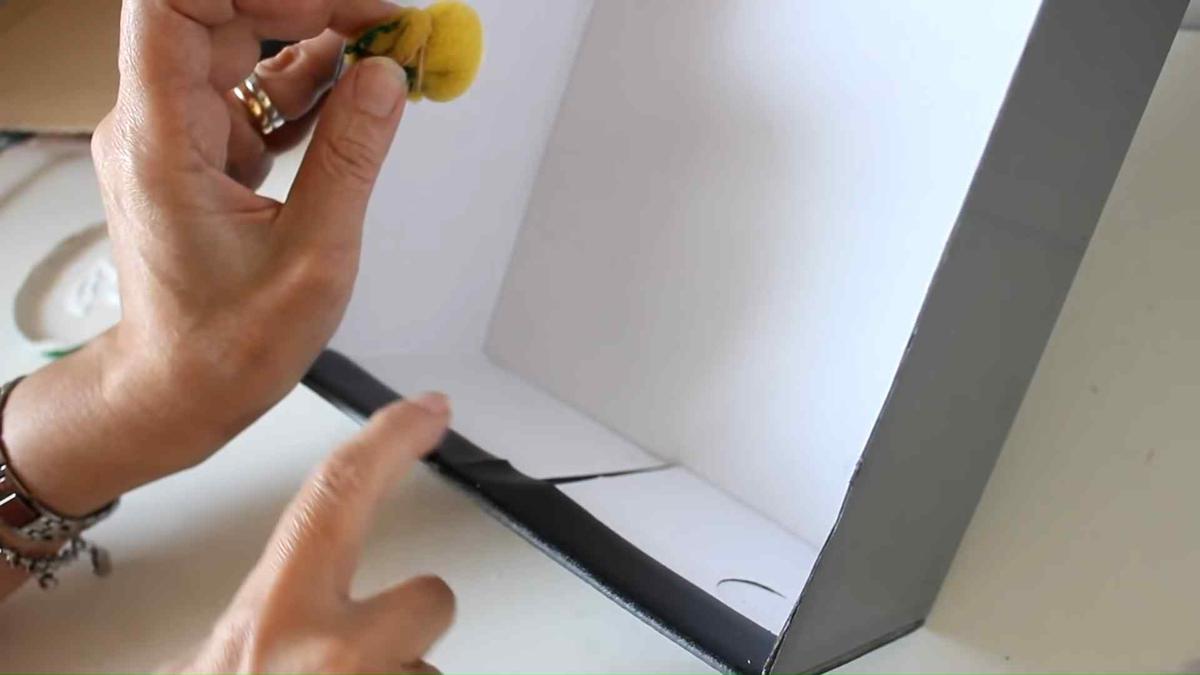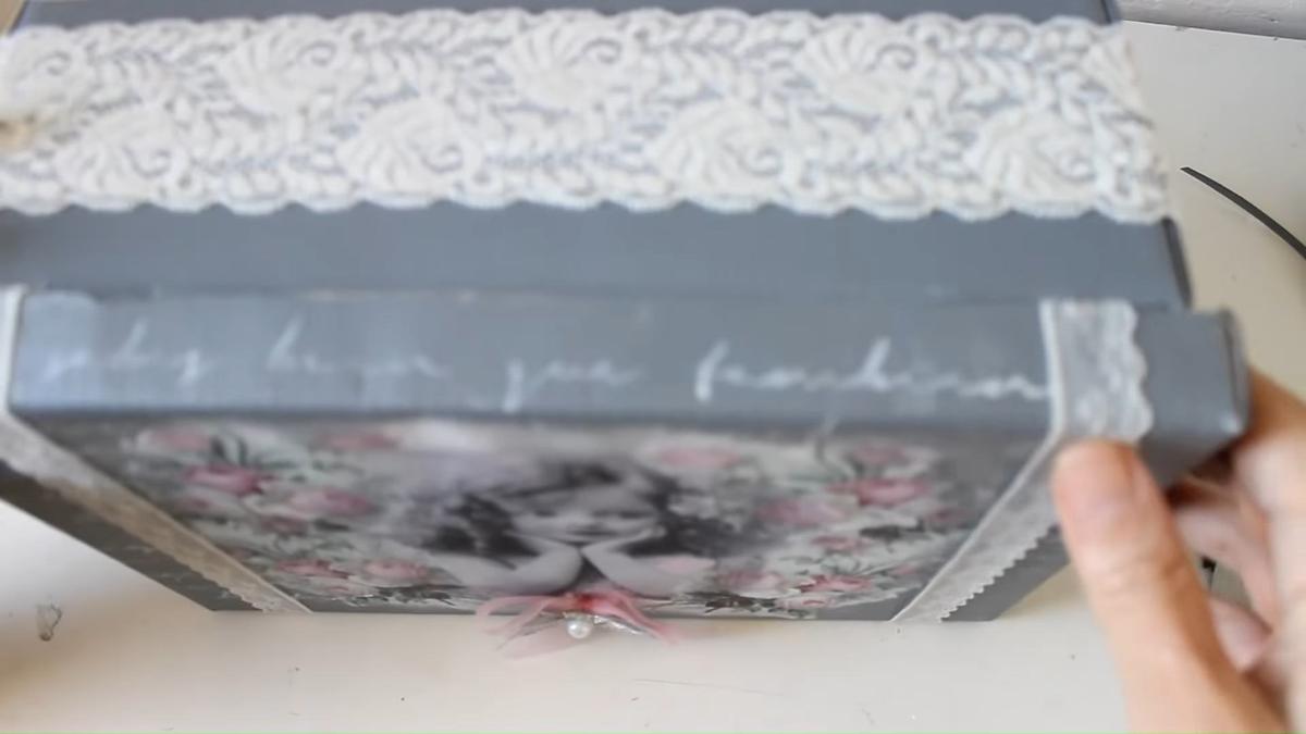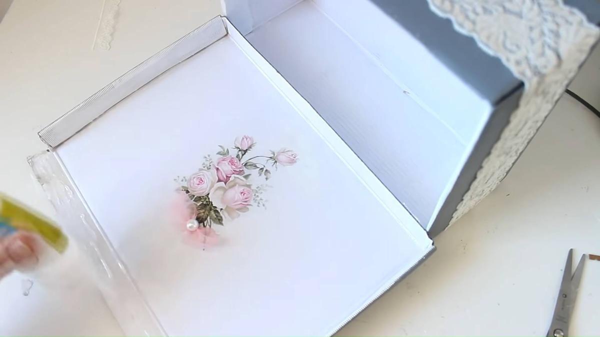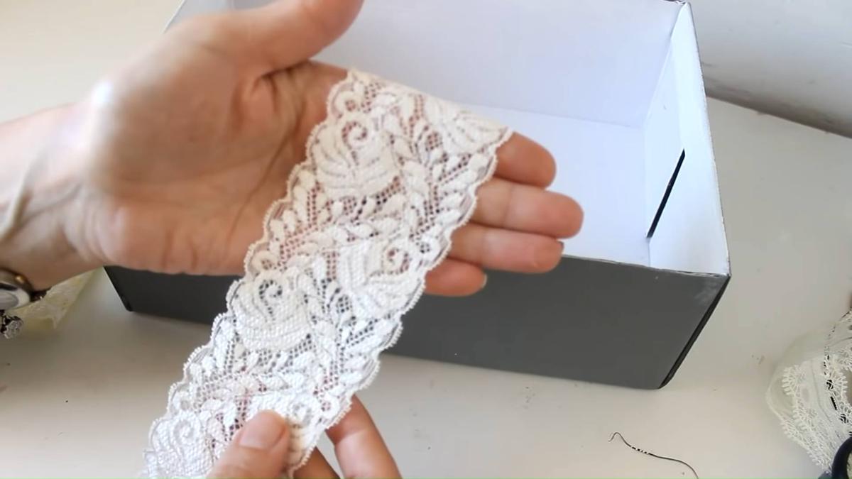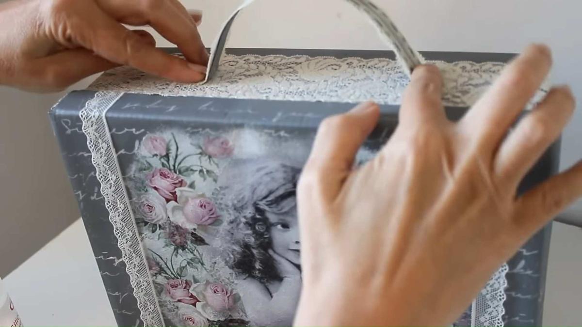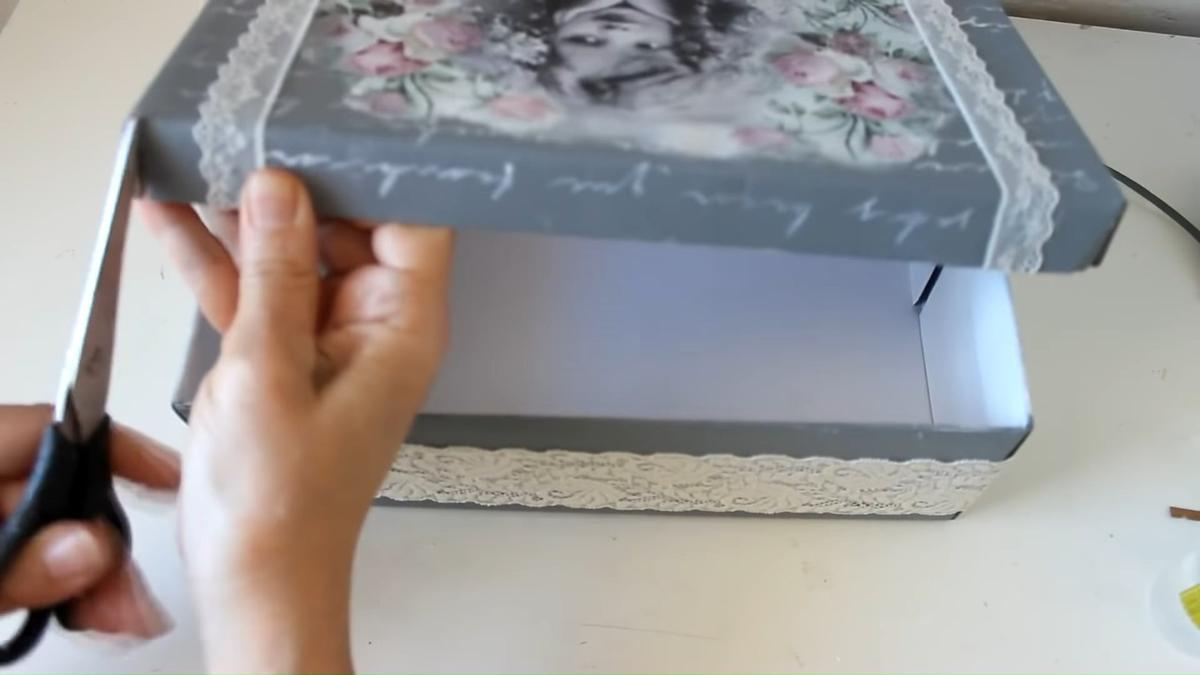 ahora en la parte inferior de la caja voy a pegar esta puntilla dejando libre la parte superior que es donde después va a calzar la tapa y la voy a ir pegando todo alrededor.