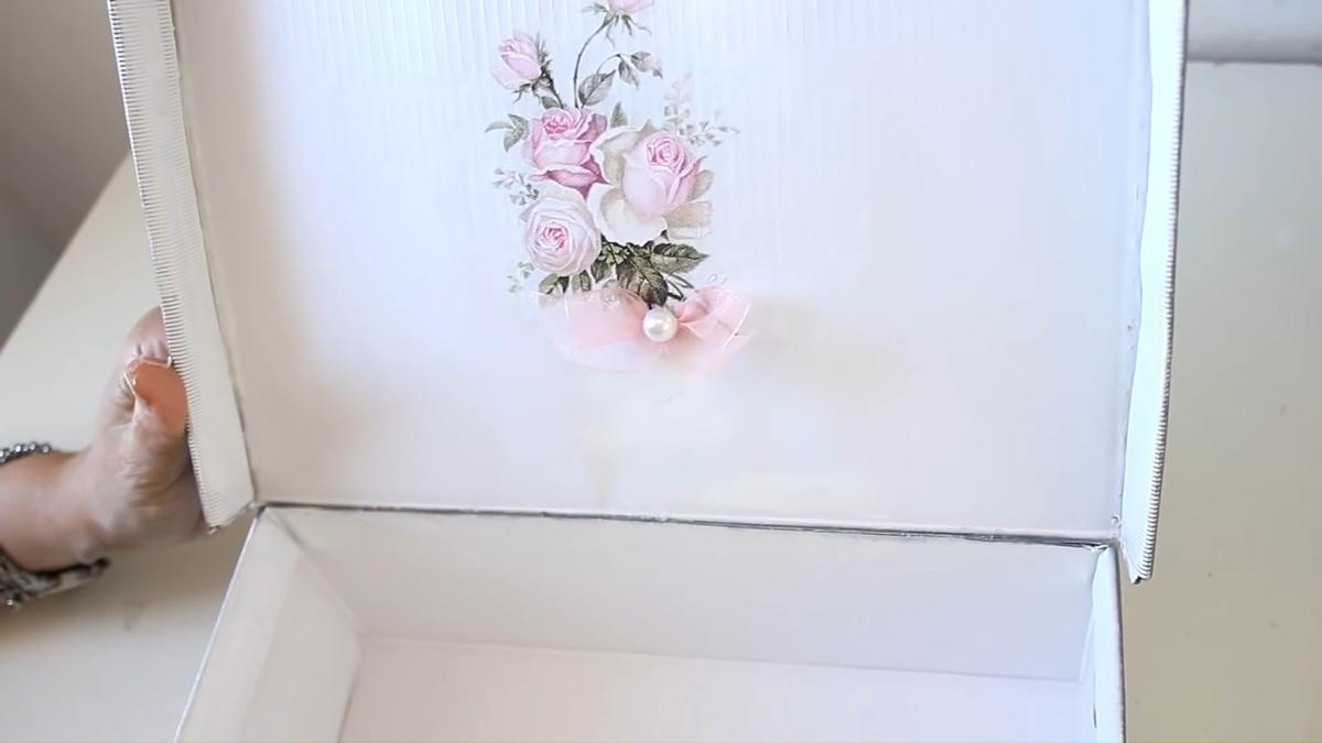 en la parte interior también hice decoupage con el mismo motivo de rosas y también con el mismo stencil y pintura gris