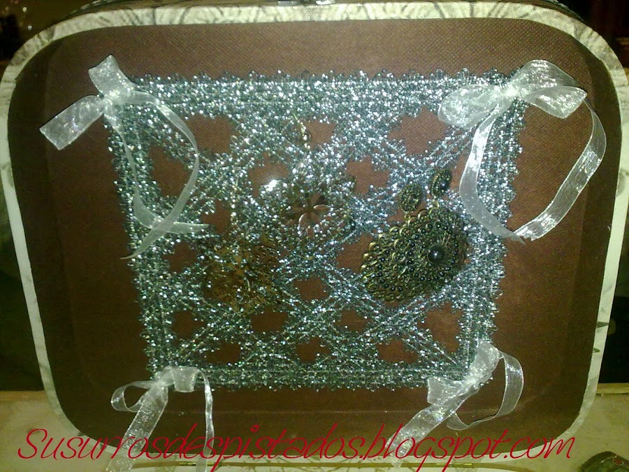 Para la tapa ingenié un entramado de pasamanería donde poder colgar los pendientes y poder aprovechar también ese espacio.