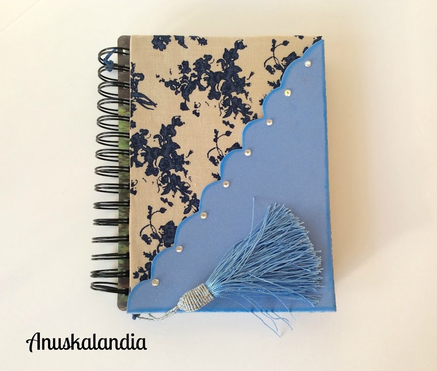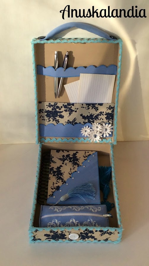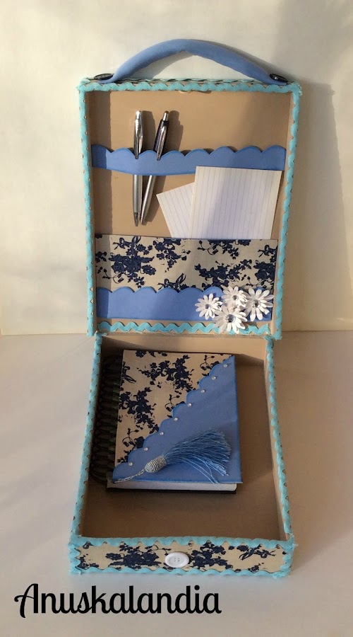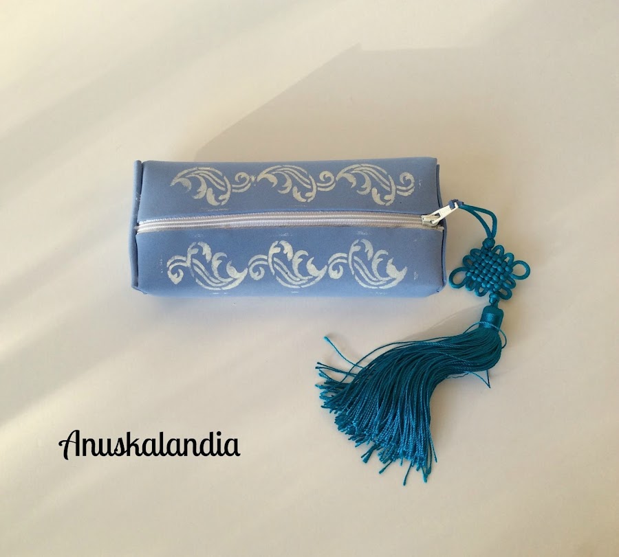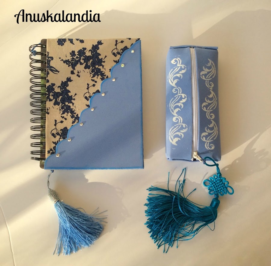 Dentro, y esa es la sorpresita, va un cuaderno decorado igualmente que el maletín y un estuche del mismo material. El dibujo del estuche está hecho con un estencil y pintura acrílica blanca.