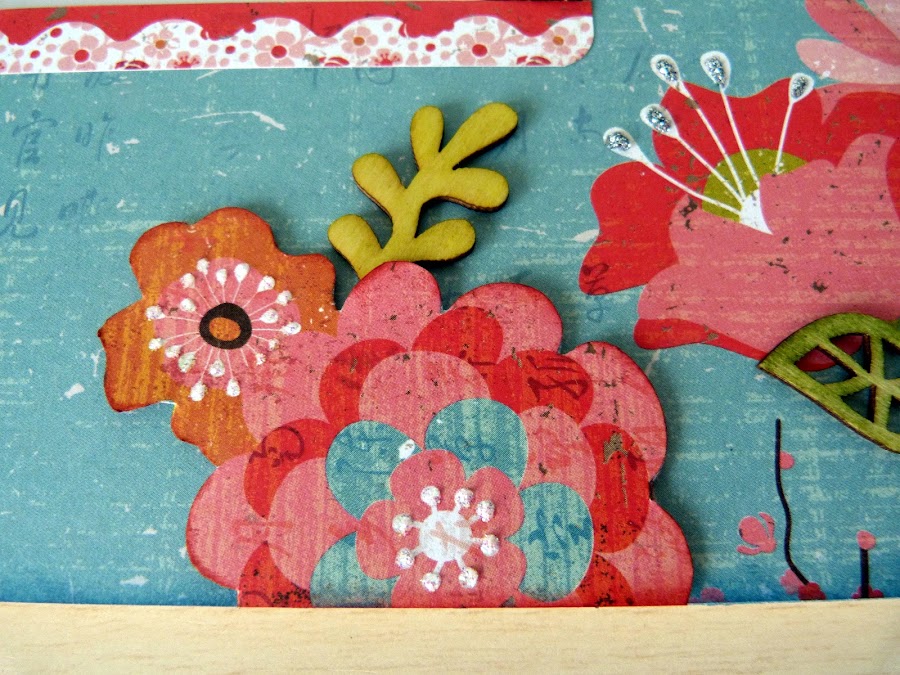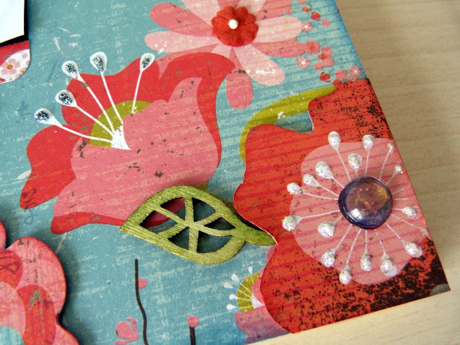 Las flores son recortes del mismo papel con toques de stickles y las hojas son troqueles de madera de Kars, entintados con distress.