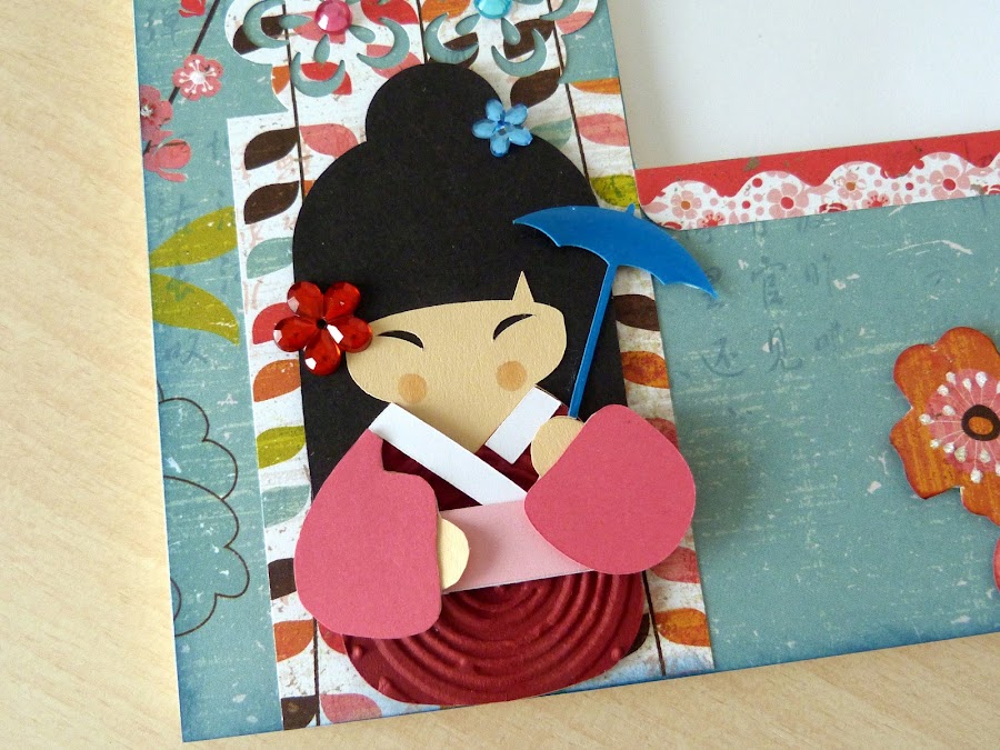 La muñeca, de la colección de archivos en svg se llama Kyoto Kuties, está recortada con la Craft y montada con el sistema de paperp piecing para darle volumen. El paraguas lleva una capa de glossy.