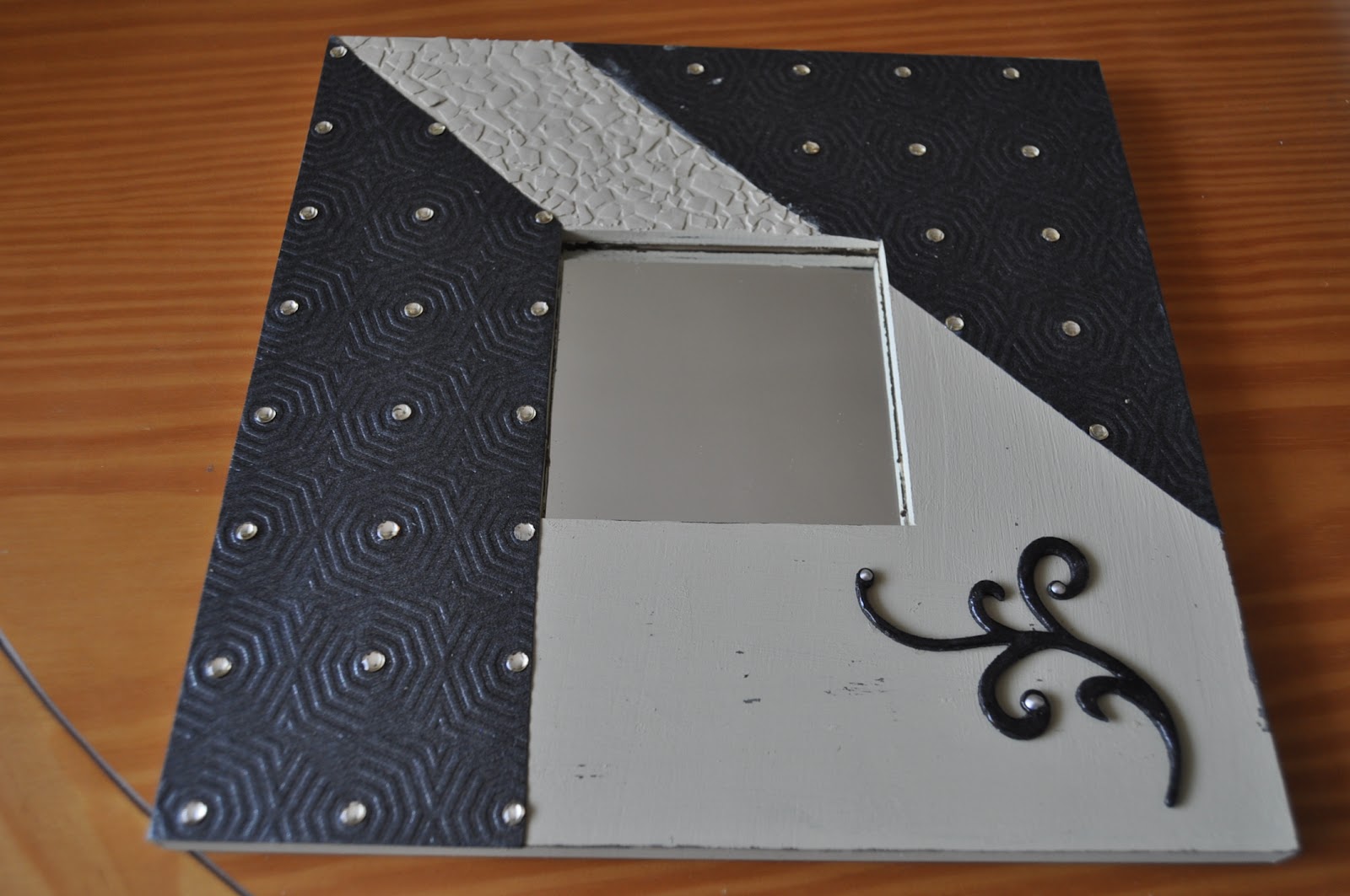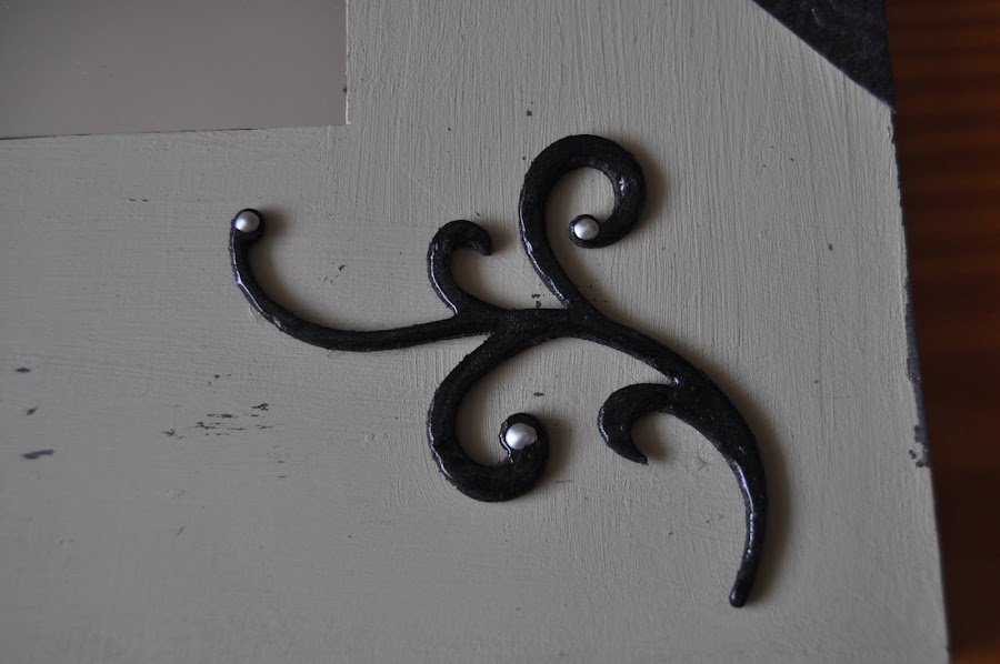 Para rellenar la parte de madera más grande, le coloqué un arabesco troquelado en goma eva al que le di Mod Podge para que cogiera relieve y brillara. Como toque final, le puse una gotita de Liquid Pearl plateado en los extremos redondos del arabesco.