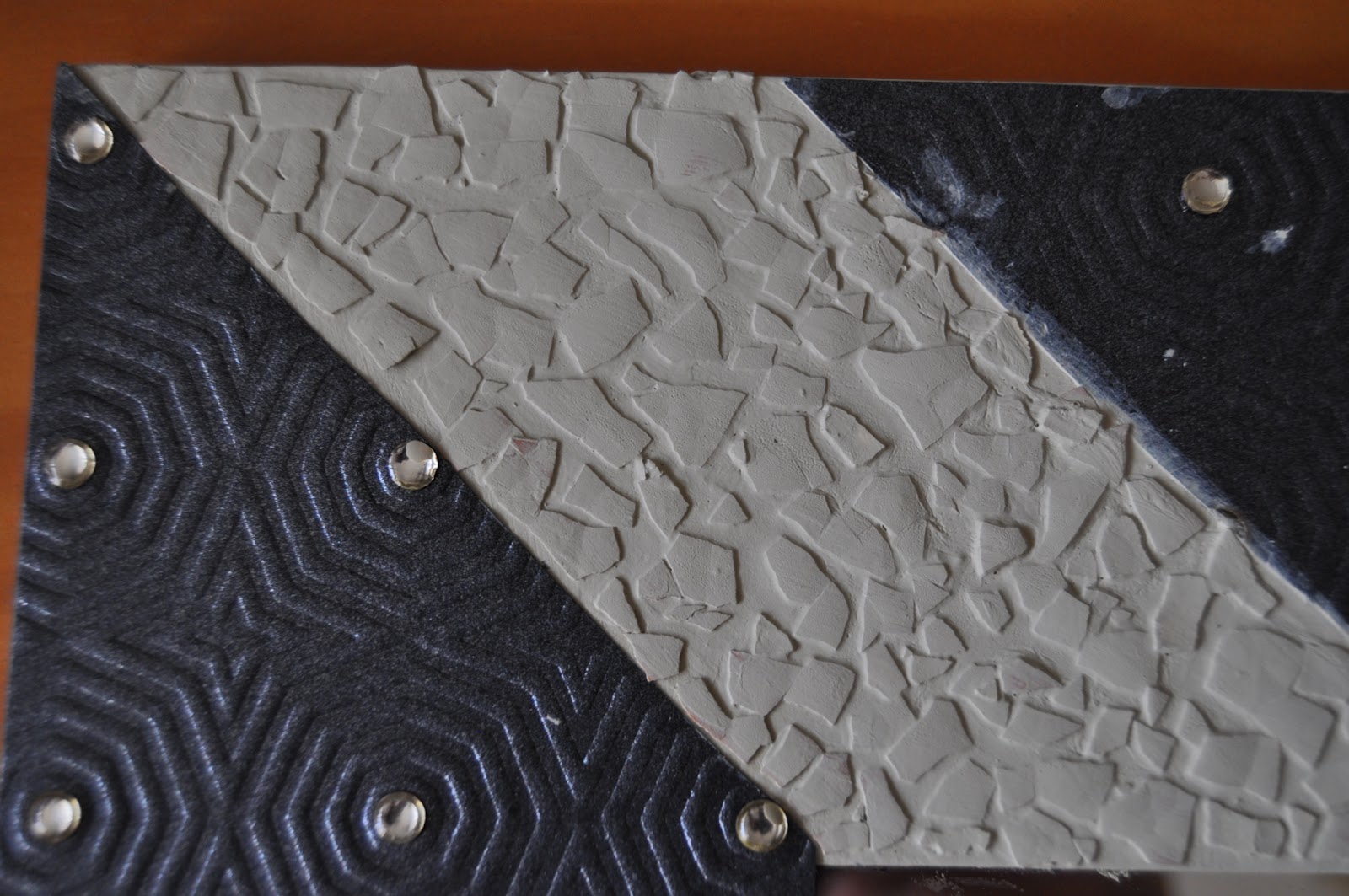 Una vez que lo tuve pintado y decapado, me encontré con un trozo de papel texturado y con brillantitos que le pegaba muy bien. Y, en vez de colocarlo en una diagonal como lo había cortado en un principio, se me ocurrió partirlo en dos y hacer dos trozos diferentes. Entre ellos coloqué la cáscara de huevo y la pinté del mismo color que la dominante en el malma.