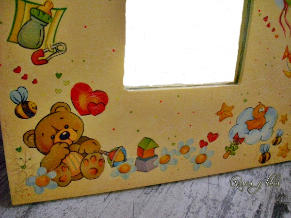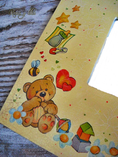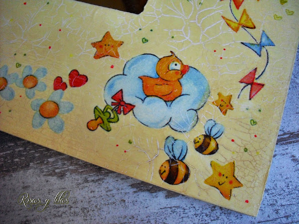 En esta ocasión he querido cambiar y dejar el consabido rosa para niña y darle un toque alegre con este amarillo vainilla de fondo, novedad en mis trabajos, que casi siempre pinto de color champagne.