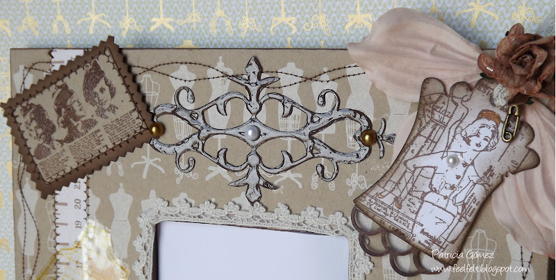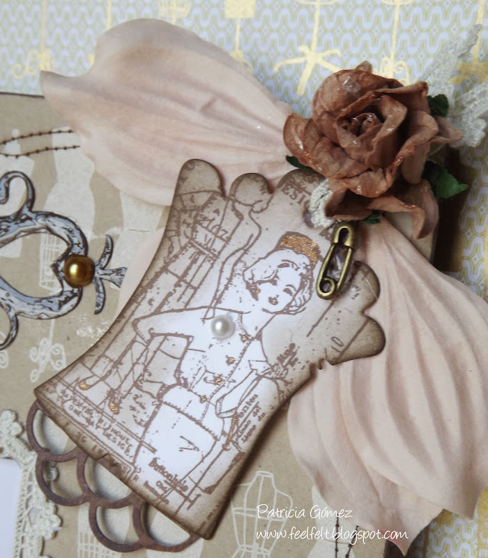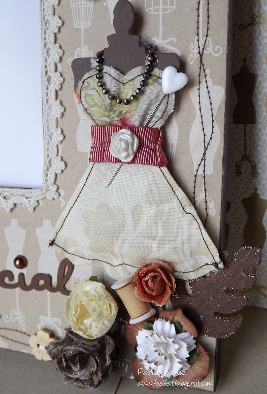 El maniquí es el troquel Tim Holtz Sewing Room, troquelado en chipboard, pintado con acrílica Dabber Earthtones Espresso. Lleva vestido cosido a mano con unas telitas que me regaló Mariselu, cinta a modo de cinturón y adorno de resina en en centro.