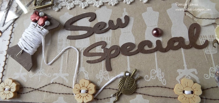 El texto Sew Special ha sido recortado con la Craft Robo (vairas capas) y teñido con Dabber Earthtones Espresso (también usado para el chipboard de la bobina de hilo)