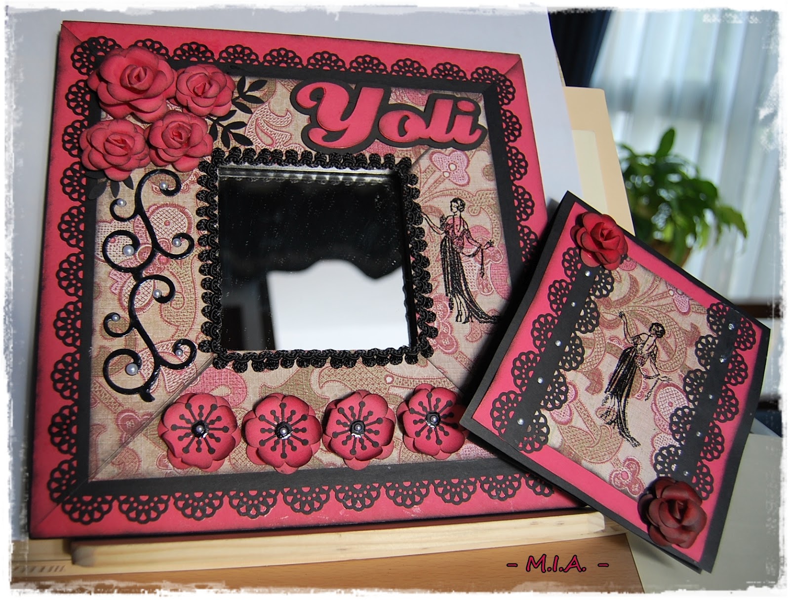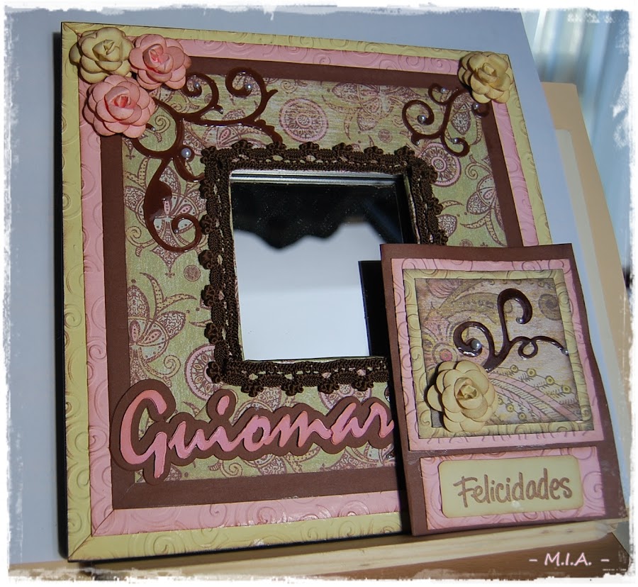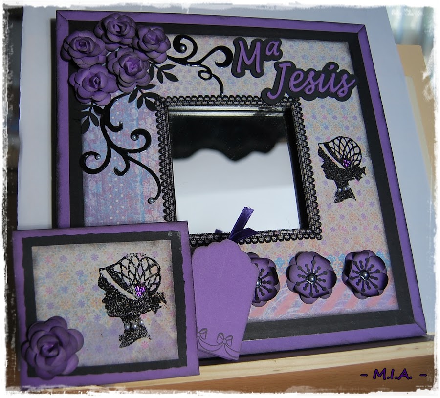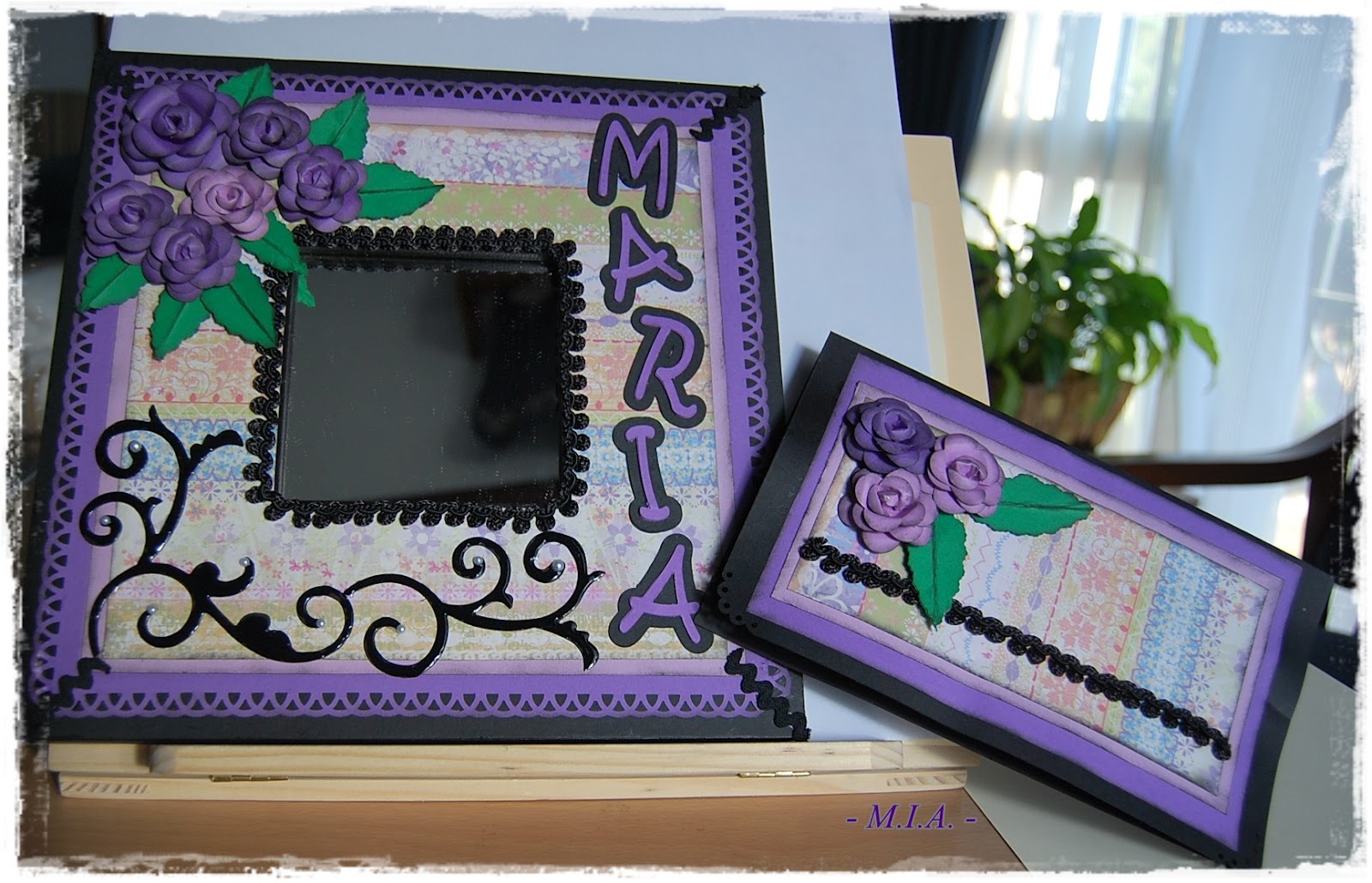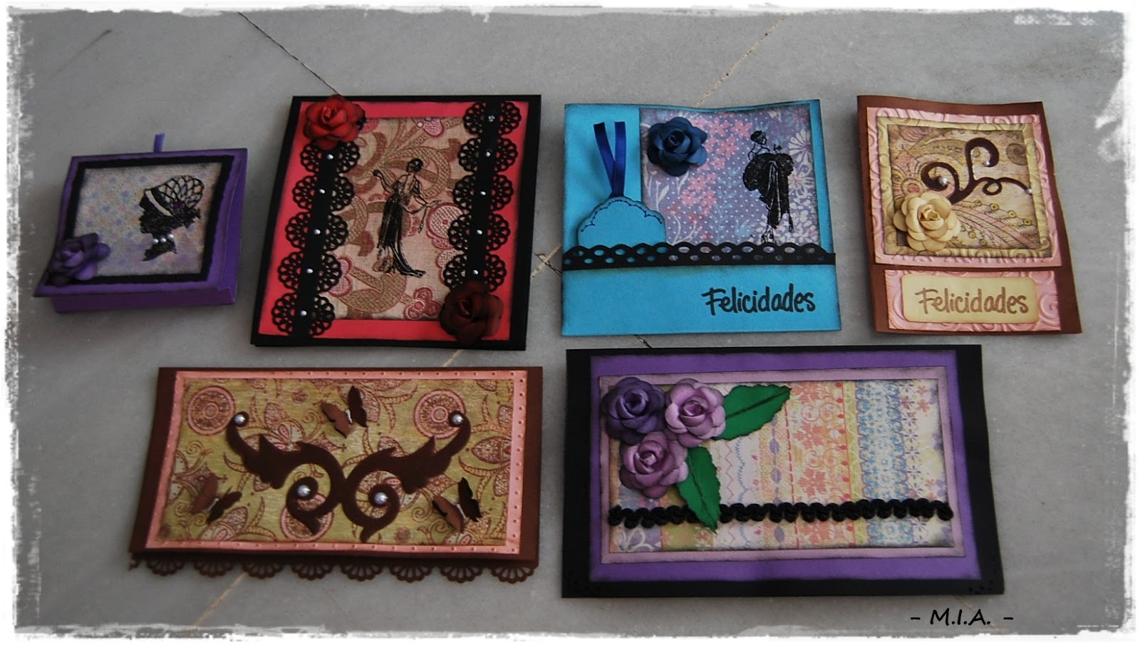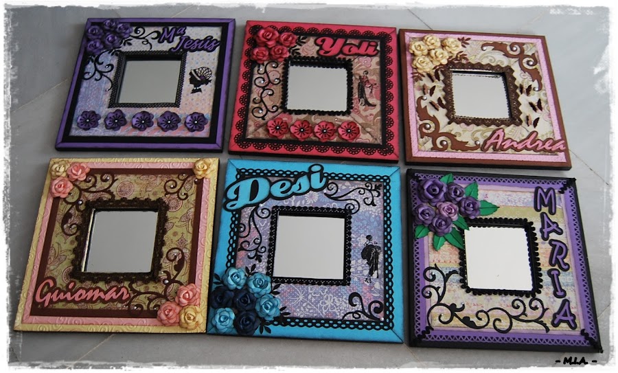 Aquí están. Van personalizados con el nombre de cada una cortados con la Craft Robo. Son papeles scrap combinados con cartulinas de color en los mismo tonos. Van adornados con flores hechas a mano y unos arabescos gentileza de Ruth y Patricia, tratados con glossy acent para que tengan volumen y perlitas blancas en los extremos. Algunos llevan unos sellos embosados en polvos negro y pistola de calor.