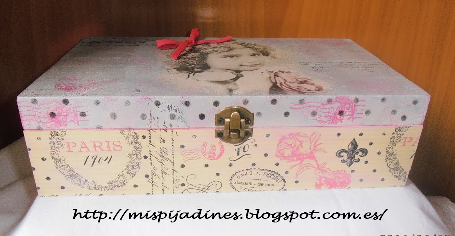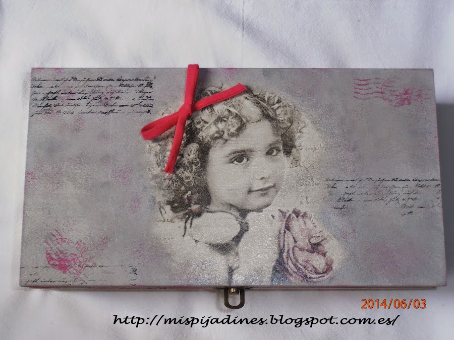 Caja joyero, pintada la tapa en gris claro, decoupage de una niña preciosa y sellos de escritura....