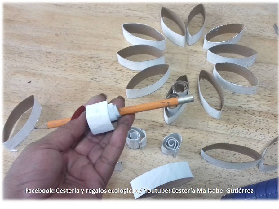 Algunos aros los cortamos de un extremo, de tal manera que queden tiras largas las cuales vamos a enrollar sobre un lápiz...
