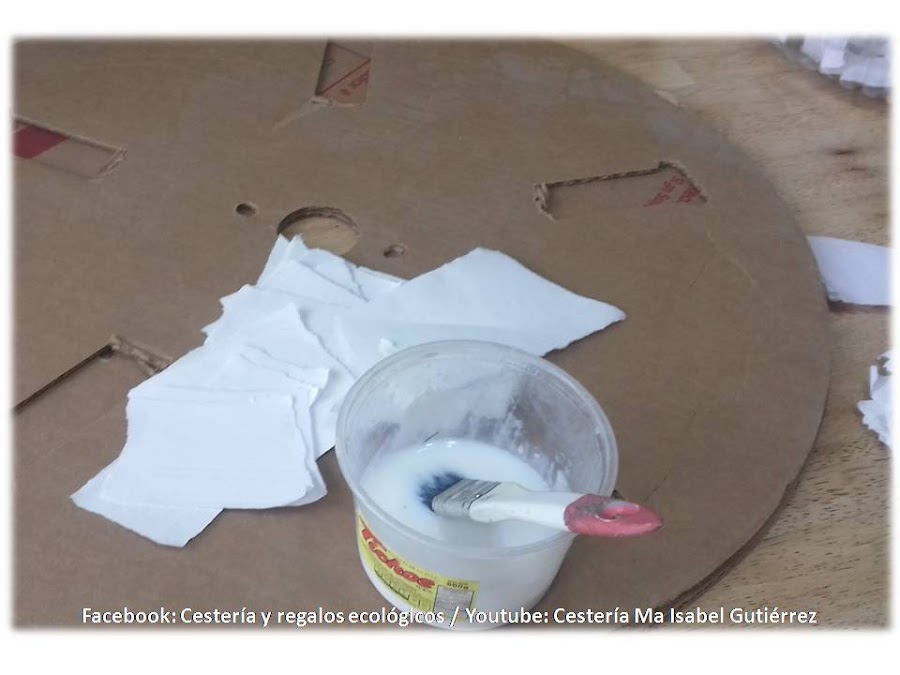 La cartapesta consiste en pegar pedazos de papel, cortados con nuestras manos, no con tijeras; con una mezcla aguada de pegamento o cola blanca y agua. El papel puede ser de todo tipo, de diarios, revistas, folletos o papel de oficina reciclado. Aplicamos dos capas alrededor de las ruedas de cartón...
