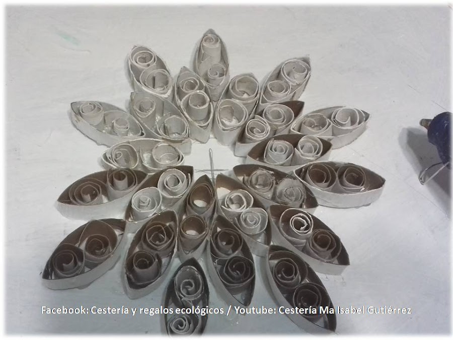 Formamos la flor principal con 10 aros o pétalos, (pegando con silicón) teniendo cuidado que un pequeño extremo de los aros queden pegados por dentro del círculo que delineamos... Los aros que están todos blancos son de un trabajo anterior, por eso se ven diferentes a los primeros...