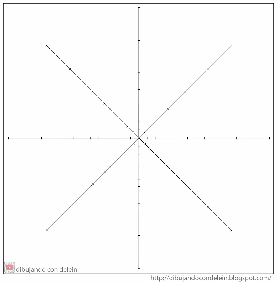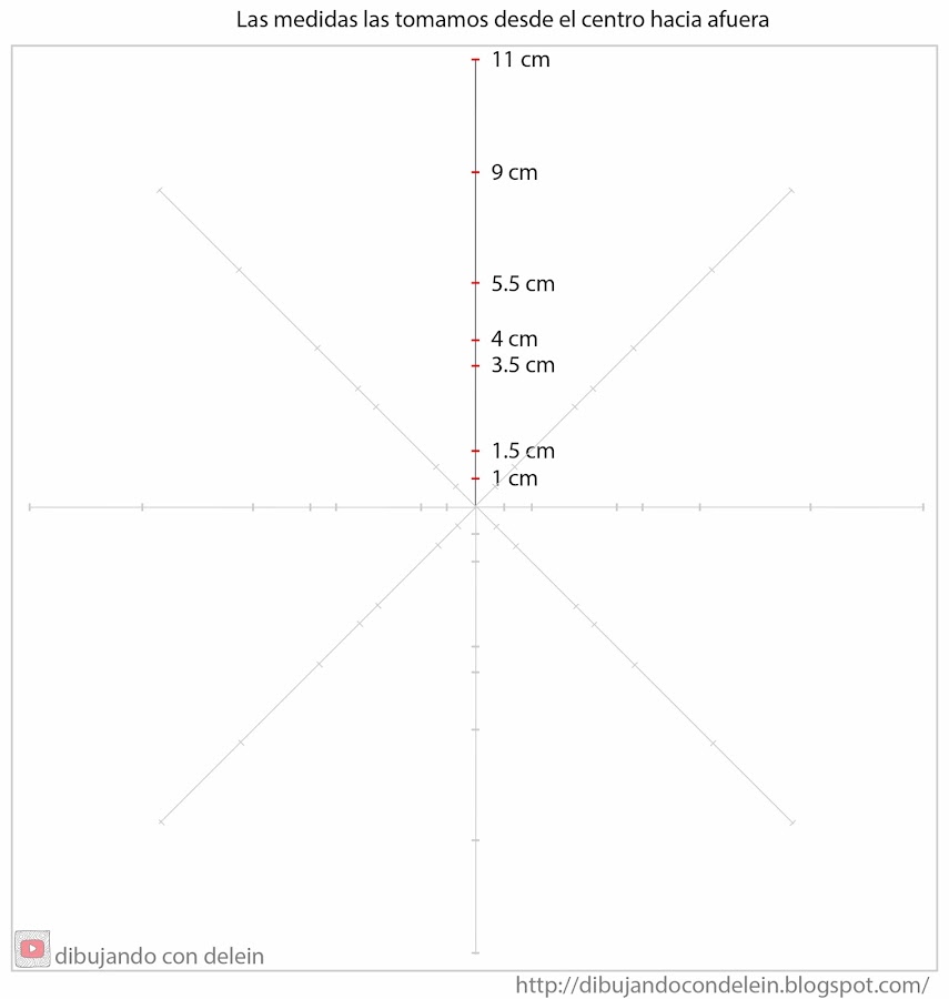 Luego de trazar las lineas, vamos a hacer unas marcas en las lineas desde el centro hacia afuera, esto lo vamos a repetir en todas las lineas, en la imagen que les dejo a continuación les muestro las medidas que vamos a tomar