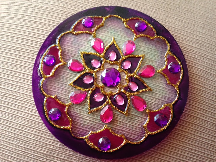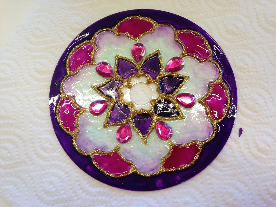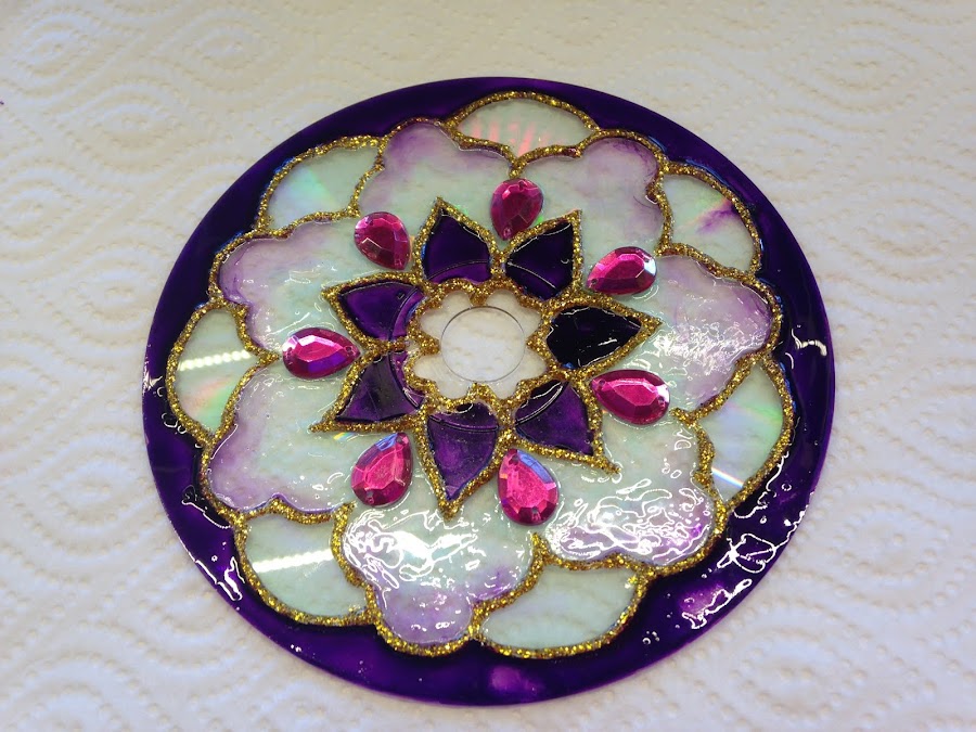 CD, pasta para falso vitraux y laca vitral. Figuras de acrílico de colores al tono y pegamento transparente.