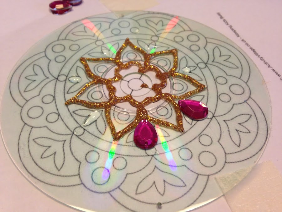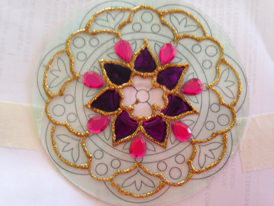 Se coloca el CD limpio sobre el motivo, se sujeta con cintas y se contornea con la pasta para falso vitraux. Luego ir pegando las figuras de acrílico.