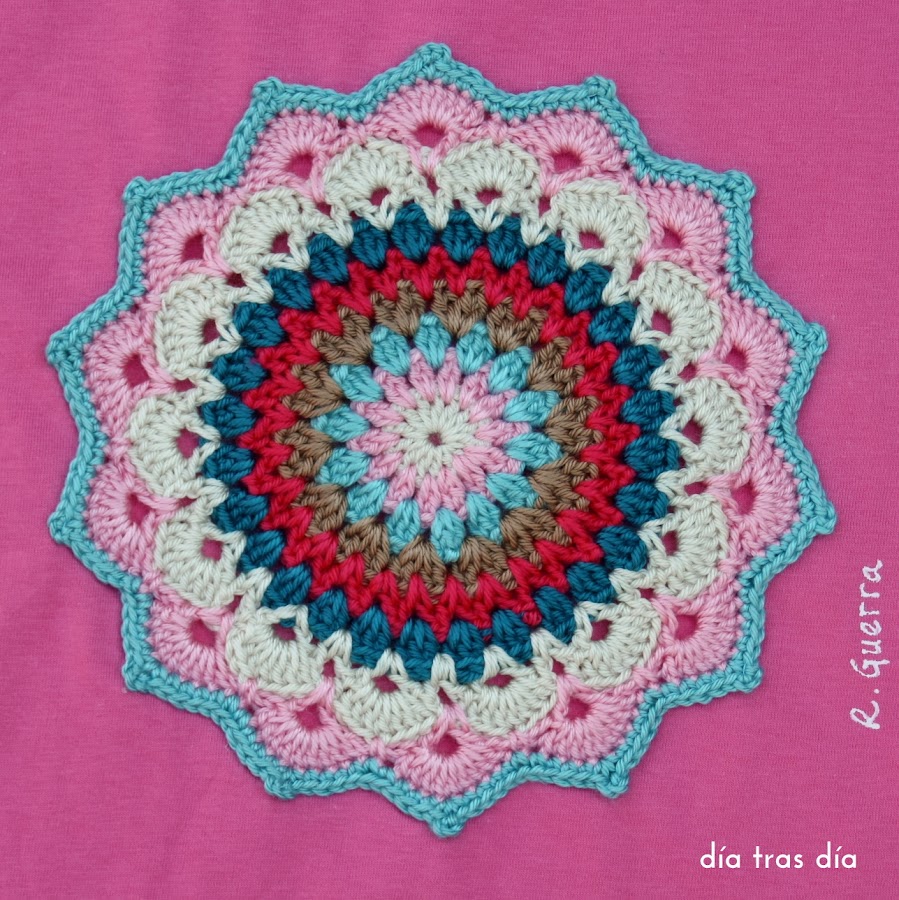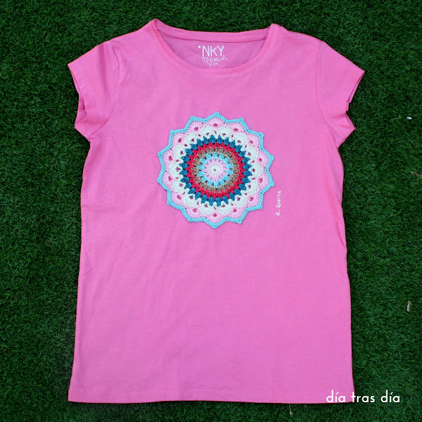 Y como he estado todo el verano casi sin coger la aguja de crochet (sólo la he sacado para hacer la medusa que os enseñé en esta entrada), reconozco que tenía un poco de “mono” y me decidí por decorar la camiseta y la mochila con sendos mandalas, como los que os enseñé aquí.