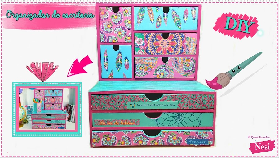 Papeles decorativos de vuestra preferenciaLas cajoneras y los porta lápices que yo empleo en el vídeo son de la marca Artemio y los podéis encontrar fácilmente en tiendas de manualidades o especializadas.