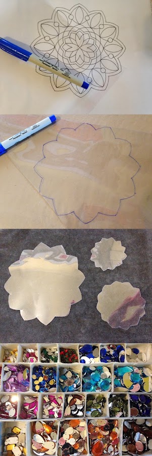Utilicé planchas de PVC, pueden ser de radiografías previamente decoloradas con cloro o lavandina. Elegí el diseño que lo saque de acá: http://manualidades.innatia.com/c-manualidades-adolescentes/a-imagenes-de-mandalas-para-imprimir.html. Tienen además hermosos mandalas para imprimir. Coloque el PVC sobre el diseño y lo recorté porque quería que tenga forma de estrella.