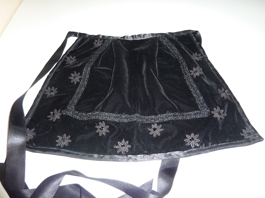 Esta hecho en terciopelo negro con lazo de seda, pasamaneria y flores de algodon con una bolita de cristal negra en el centro.