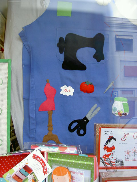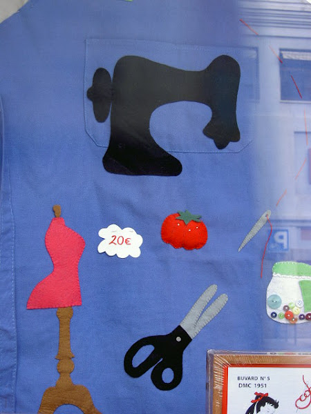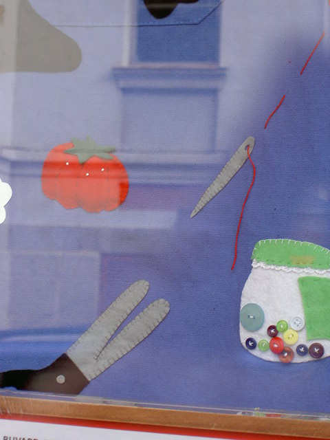 Un mandil con motivos de costura... en tono azul...con alfiletero o acerico en la parte superior.....