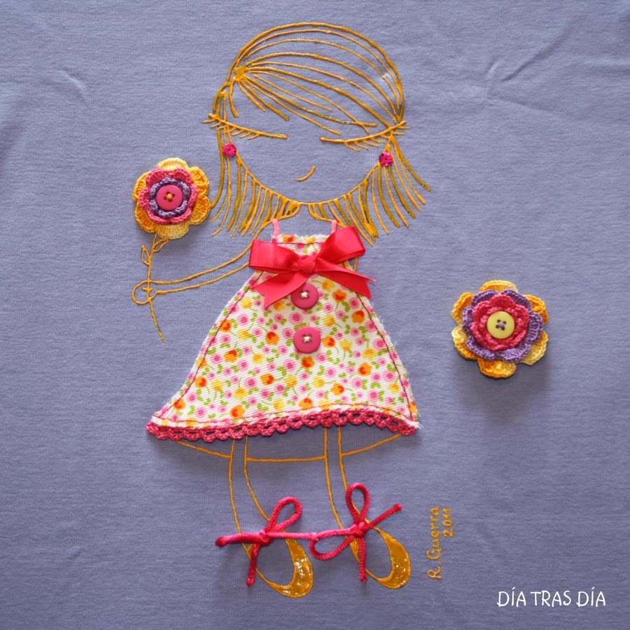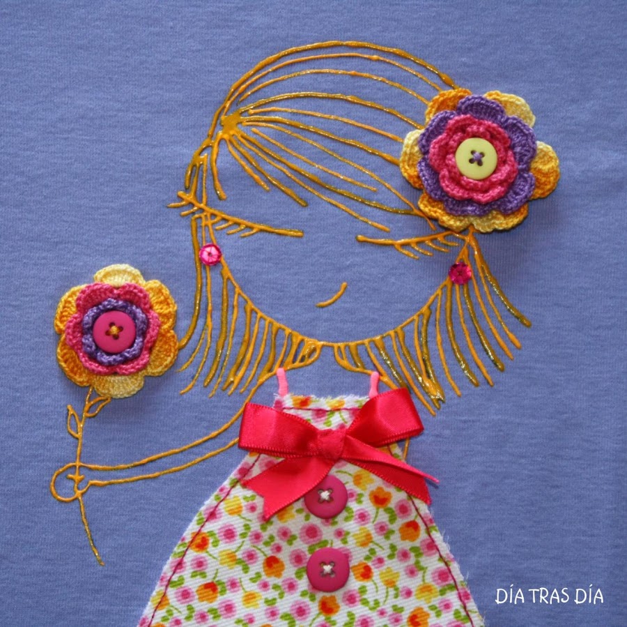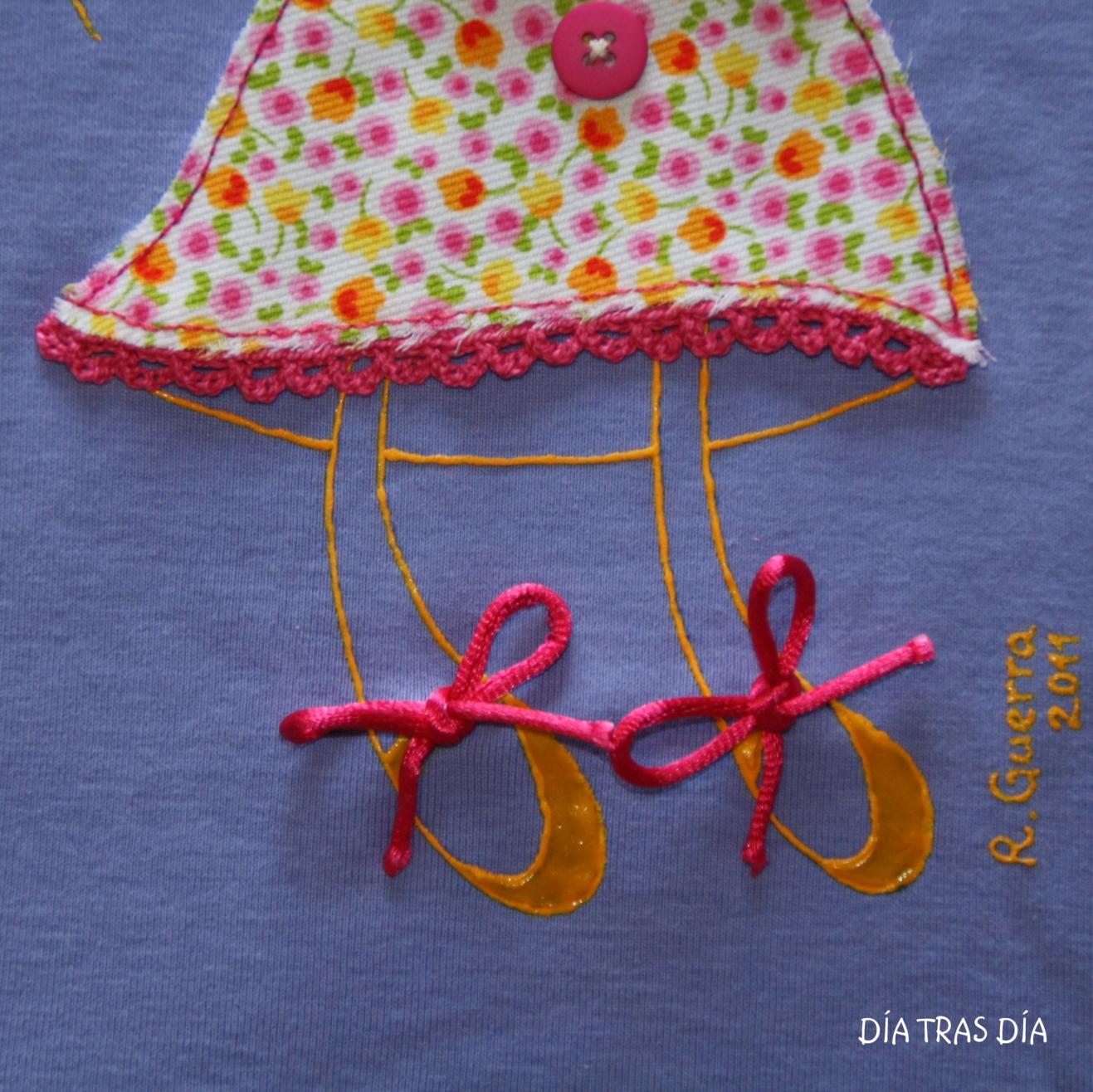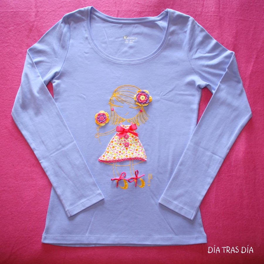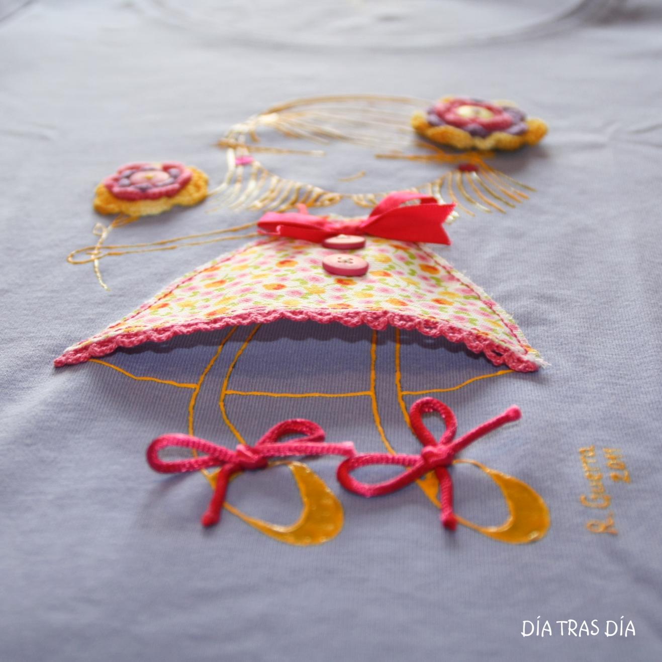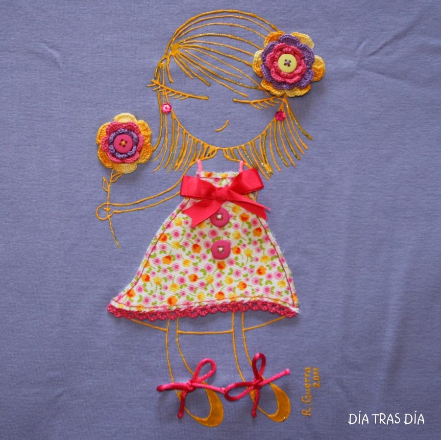 He partido de una camiseta en color malva como base y para darle un poco de alegría, la he decorado con tonos amarillos, fucsias y morados.