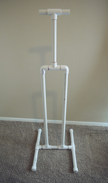 Una vez forrado, podemos armar una base con caños de PVC de 3/4 pulgadas con codos y T de 90. La medida mas importante es la altura. Tomar la suma del largo de talle trasero mas el largo de pantalon como referencia para el alto del soporte.