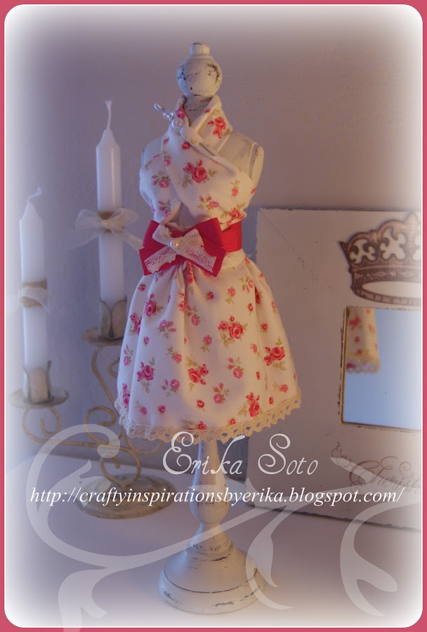 bueno pues estaba detrás de un maniquí para ponerlo encima de la cómoda de mi dormitorio y me lo compre en crudo, así que me puse manos a la obra, lijandolo, dándole tapa poros, pintura chocolate,pasandole una vela, luego pintura blanca, lijando nuevamente en fin... le di es toque desgastado que quería y compre un trozo de tela muy romántico, por lo menos a mi me gusto y creo que me venia acorde con las tonalidades de mi habitación, le hice un vestido a mi maniquí y aquí tenéis el resultado.