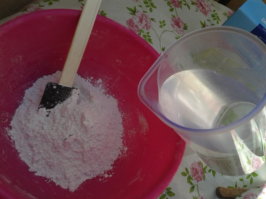 Materiales: un cuenco, un palo o cuchara, yeso o cemento blanco, guante (si es pequeño mejor para que quepan los anillos despues),pinzas y agua.