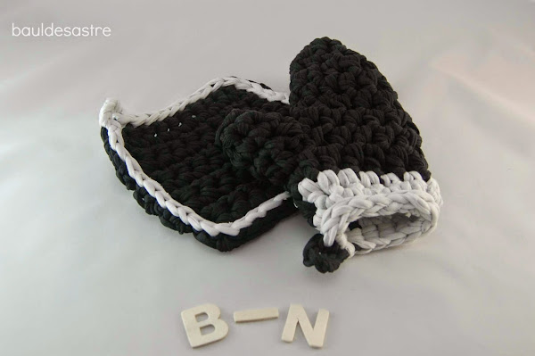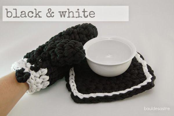 He utilizado el trapillo como material básico, y el blanco y negro como colores (esa era la condición). Cómo ante todo quiero cosas prácticas, dándole vueltas al tema pensé que dónde más combinaban estos colores era en la cocina de mi casa, así que me decanté por unas manoplas para el horno.